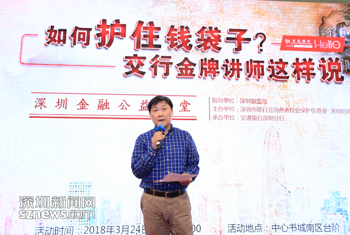 3月24日,在深圳中心書城南臺(tái)階,由深圳銀監(jiān)局指導(dǎo),深圳新聞網(wǎng)、深圳市銀行業(yè)消費(fèi)者權(quán)益保護(hù)促進(jìn)會(huì)主辦,交通銀行深圳分行承辦的大型系列公益活動(dòng)“深圳金融公益講堂”第四講如期開(kāi)講。活動(dòng)邀請(qǐng)了來(lái)自交通銀行深圳分行的三位金牌講師從專業(yè)角度為市民朋友們?cè)敿?xì)講解理財(cái)知識(shí),現(xiàn)場(chǎng)解答市民的金融消費(fèi)困惑。