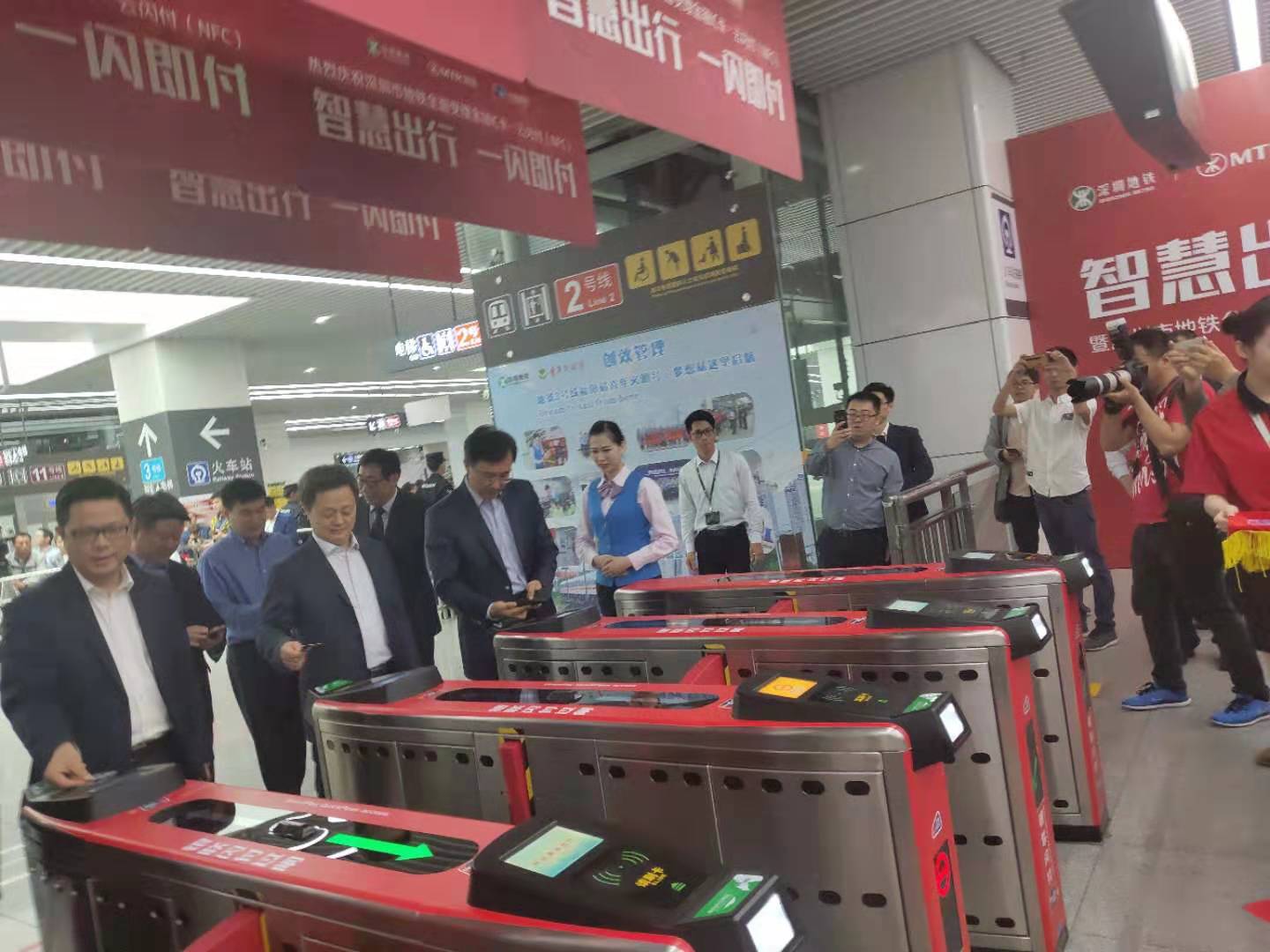 3月1日上午,五洲賓館內(nèi)舉行了“深圳市地鐵金融IC卡過閘服務(wù)”的啟動儀式。中國人民銀行副行長范一飛、深圳市人民政府副市長艾學(xué)峰、招商銀行總行副行長劉建軍、中國銀聯(lián)董事長邵伏軍、招商銀行深圳分行行長岳鷹、深圳地鐵董事長辛杰、港鐵(深圳)總經(jīng)理黃琨暐等相關(guān)領(lǐng)導(dǎo)出席了啟動儀式,并共同點亮LED燈幕,宣告深圳市地鐵8條線路的所有車站正式啟用過閘功能。