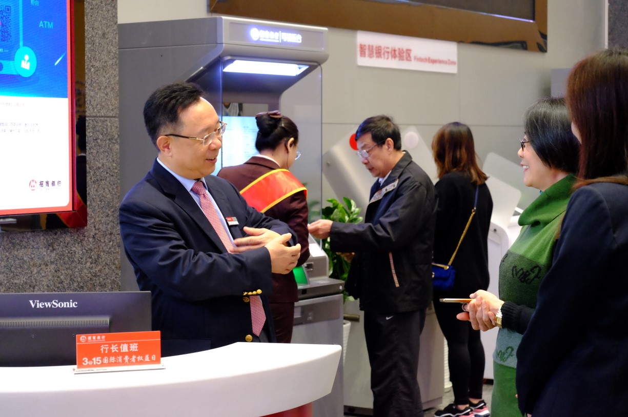 3月15日當天,招商銀行深圳分行開展了“黨委班子下基層”之“當值大堂經理”活動。分行黨委班子成員以普通黨員身份深入一線,到營業(yè)網點大堂“戴黨員徽章、亮身份、作表率”,聯(lián)合支行行長隊伍,通過率先垂范宣傳消保知識,鼓勵基層黨員和群眾共同關注消費者聲音,前來辦理業(yè)務的客戶紛紛表示感受到招商銀行真誠貼心的服務,猶如春日里縷縷陽光,溫暖著客戶的心。
