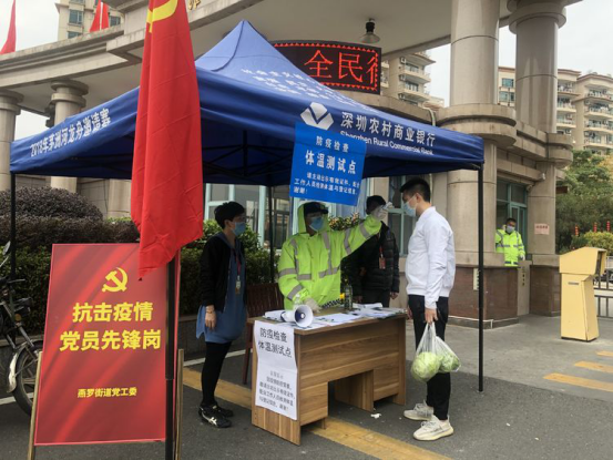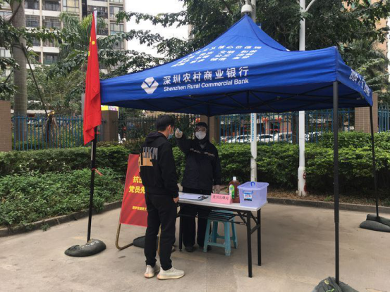 隨著疫情防控形勢的發(fā)展,深圳各街道各社區(qū)都不斷加強(qiáng)疫情防控,在道路口、社區(qū)出入口、樓棟出入口對進(jìn)出車輛和人員進(jìn)行篩查。在燕羅街道、松崗街道轄內(nèi)的道路卡口、社區(qū)門口、街道養(yǎng)老院、工廠等防疫檢查站點,記者看到很多印有深圳農(nóng)商行名稱的藍(lán)色帳篷。一頂頂帳篷就像一把把‘保護(hù)傘’,為防控工作人員提供了遮風(fēng)擋雨的場所,也守護(hù)著轄區(qū)居民的健康。