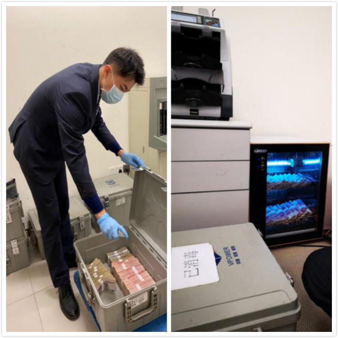 該行加強特殊時期現(xiàn)金管理,為轄內(nèi)所有現(xiàn)金網(wǎng)點配備專用現(xiàn)金消毒柜,要求回籠現(xiàn)金必須消毒處理,經(jīng)過14天的“隔離”方可對外支付,目前投放的錢盡量以原封新券為主。同時指派專人監(jiān)測自助設(shè)備運行情況,做好外包服務(wù)疫情防控的指導和協(xié)調(diào)。