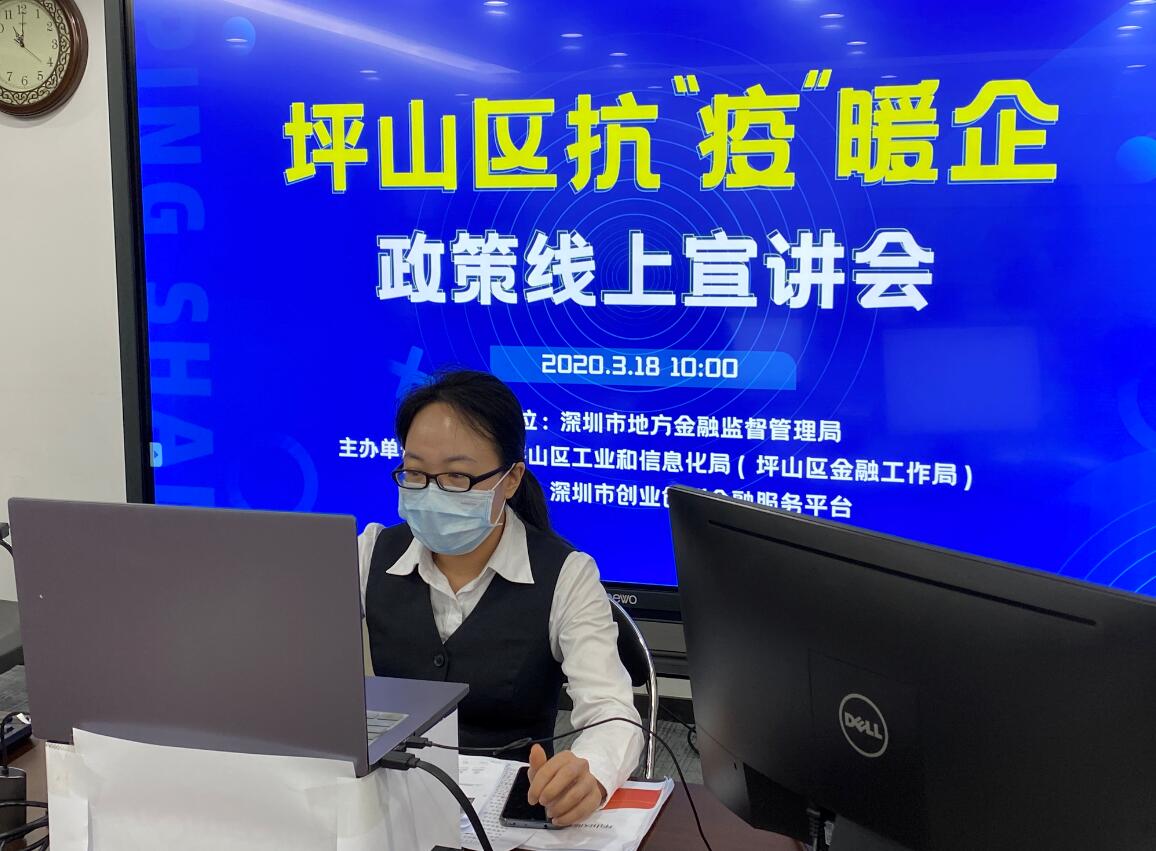 為充分支持坪山區(qū)內(nèi)企業(yè)抗擊疫情和復工復產(chǎn),攜手企業(yè)共渡難關(guān),2020年3月18日上午,深圳農(nóng)商行坪山支行通過“線上宣講”方式參加了由坪山區(qū)工業(yè)和信息化局聯(lián)合開展的抗“疫”暖企政策宣講和銀企對接系列活動?;顒又校钲谵r(nóng)商行坪山支行為區(qū)內(nèi)100多家企業(yè)詳細介紹該行在抗疫期間推出的“抗疫周轉(zhuǎn)貸”、“抗疫訂單貸”、“抗疫醫(yī)療貸”等專屬產(chǎn)品,同時也為企業(yè)推薦了“速抵貸”、“速易貸”、“稅e貸”、“通發(fā)貸”等特色產(chǎn)品。