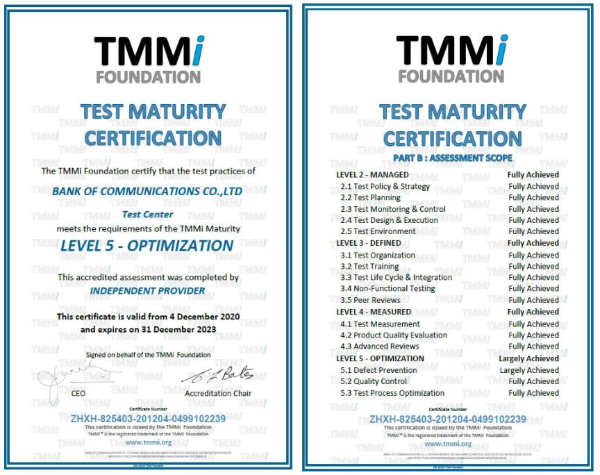 TMMi認(rèn)證是當(dāng)前國際上最權(quán)威的測試組織成熟度認(rèn)證體系,也是軟件產(chǎn)品質(zhì)量管理水平最有力的資質(zhì)證明,最高級別為五級。此次獲得五級認(rèn)證,標(biāo)志著交行的軟件測試能力、產(chǎn)品質(zhì)量管理水平、風(fēng)險(xiǎn)應(yīng)對能力、測試過程改進(jìn)能力、測試技術(shù)創(chuàng)新能力的整體成熟度均已達(dá)到國際領(lǐng)先水平。
