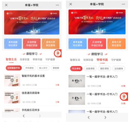 中信銀行專門給老年朋友準(zhǔn)備的“課程學(xué)習(xí)”一共有智能生活、悅享財(cái)富、琴棋書畫和守護(hù)健康四大板塊,都是老年朋友需要和關(guān)心的內(nèi)容,總課程2000余節(jié),總時(shí)長(zhǎng)超過(guò)1.8萬(wàn)分鐘。