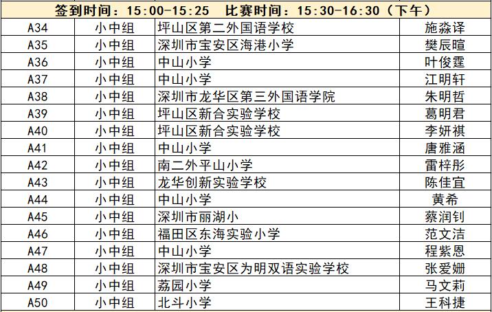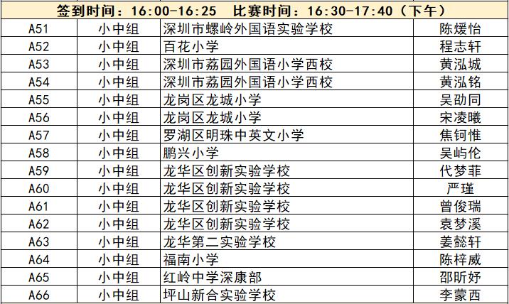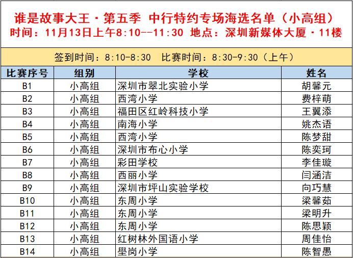 “誰是故事大王·第五季”分為小中組和小高組,此次中行特約專場海選報名的學(xué)生將以脫稿的形式,不限主題,在限時5分鐘內(nèi),講述積極健康向上的故事。評委老師們將從四個維度進行評分,其中內(nèi)容占50%、表現(xiàn)技巧占30%、儀態(tài)占10%,以及時間掌控、創(chuàng)意特色呈現(xiàn)等占10%。最終,本場活動將選拔出部分學(xué)生晉級“誰是故事大王·第五季”深圳市復(fù)賽,他們將和來自指定校園分賽區(qū)、特約專場以及線上分賽區(qū)的選手一起爭奪深圳市決賽名額。現(xiàn)將上場順序(即所在小組的序號順序)、名單、簽到時間、比賽時間公布如下: