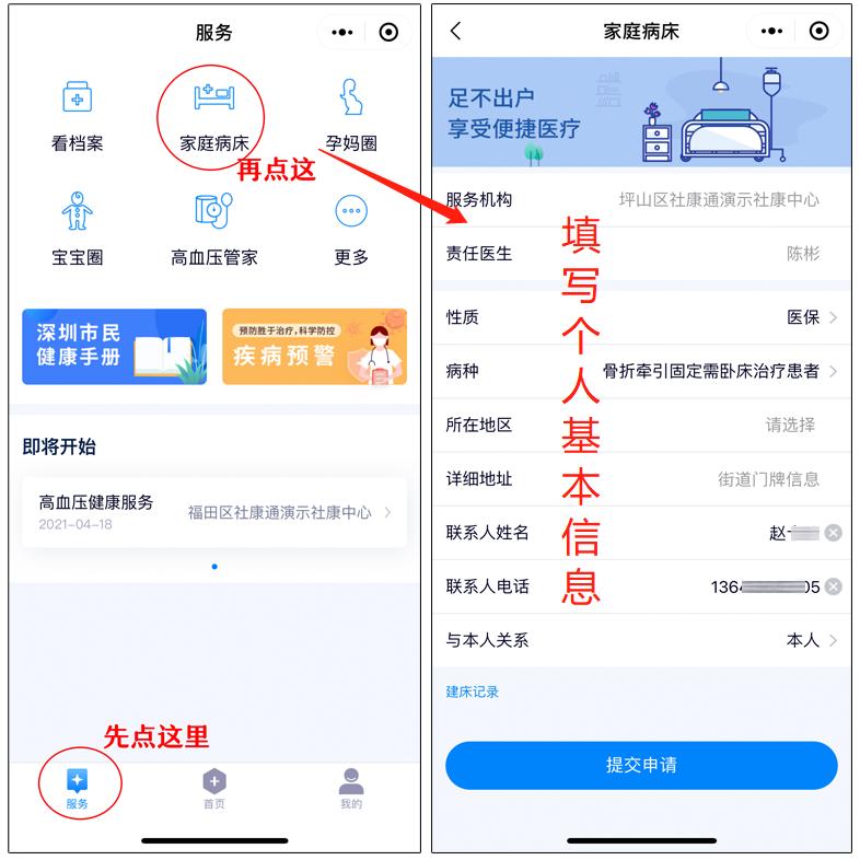 居民向家庭病床服務(wù)機(jī)構(gòu)提出申請,填寫家庭病床申請表,并提供就診記錄、住院小結(jié)、相關(guān)輔助檢查及影像報告、用藥清單等病歷資料。