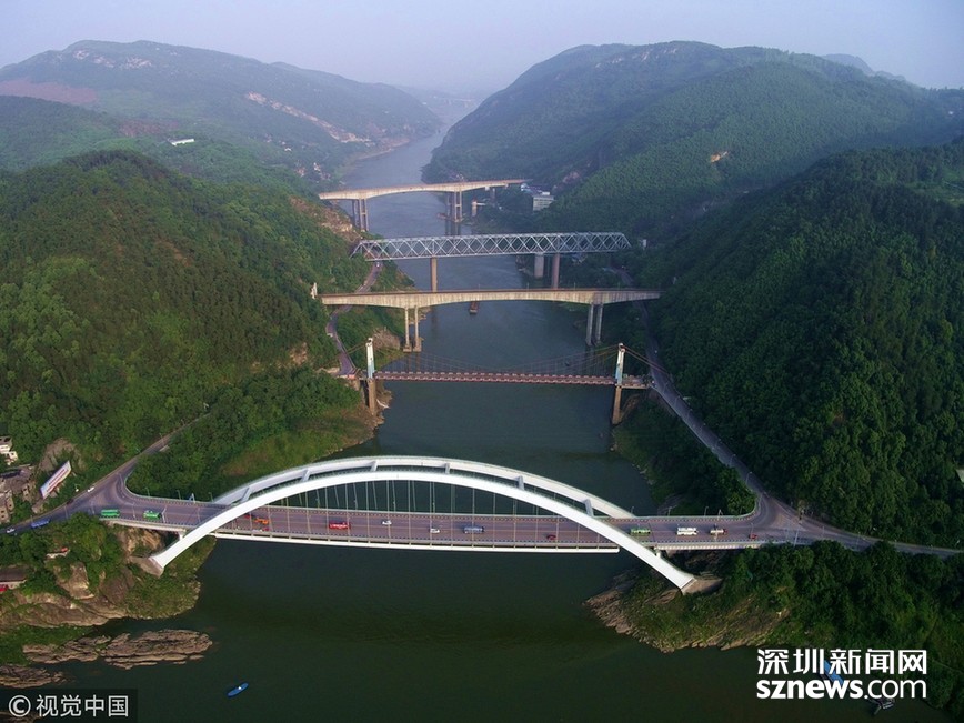 畫面中由近及遠(yuǎn)分別是新朝陽橋、老朝陽橋、遂渝鐵路橋、襄渝鐵路橋、蘭渝鐵路橋。