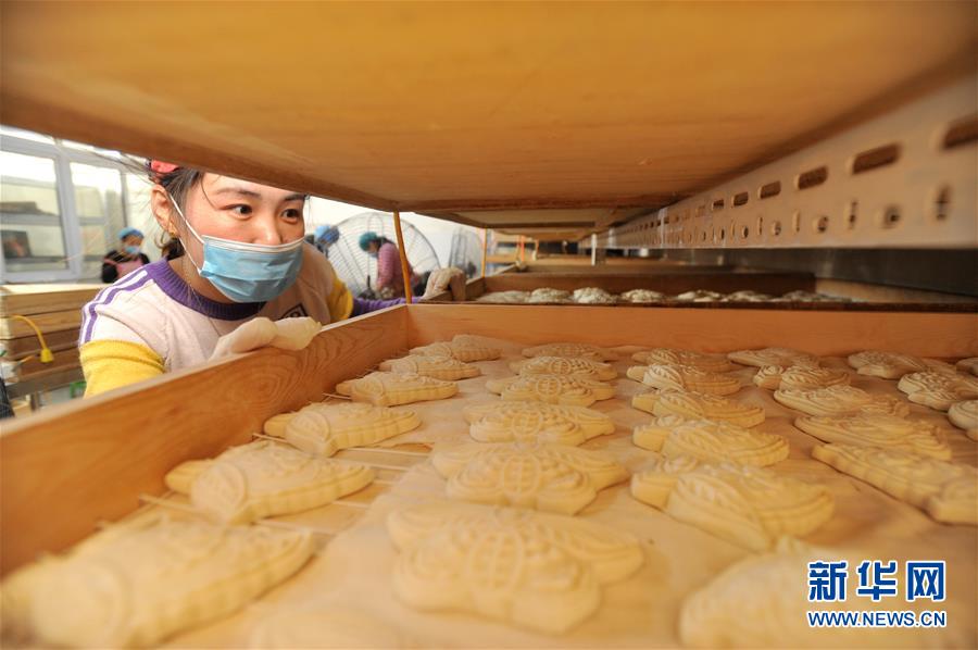 1月31日,河北黃驊市一家面花作坊的工人在查看面花。 河北黃驊市有著過年蒸面花的習俗。春節(jié)前夕,當?shù)孛婊ㄖ谱鞴S加班加點制作面花,供應春節(jié)市場。 新華社記者牟宇攝