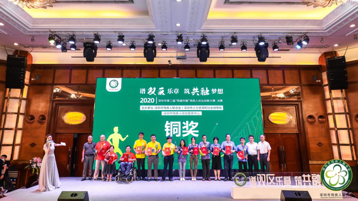 見圳客戶端·深圳新聞網(wǎng)2020年9月30日訊(記者 張俊達(dá))昨天,由深圳市殘疾人聯(lián)合會(huì)與深圳市人力資源和社會(huì)保障局共同主辦,深圳市殘疾人綜合服務(wù)中心承辦,各區(qū)(新區(qū))殘疾人聯(lián)合會(huì)、各區(qū)(新區(qū))殘疾人就業(yè)服務(wù)機(jī)構(gòu)聯(lián)合協(xié)辦的深圳市第二屆“殘健共融”殘疾人創(chuàng)業(yè)創(chuàng)新大賽決賽暨頒獎(jiǎng)典禮圓滿落幕。大賽共評(píng)選出4個(gè)金獎(jiǎng)、8個(gè)銀獎(jiǎng)、12個(gè)銅獎(jiǎng)及若干個(gè)優(yōu)勝獎(jiǎng)?,F(xiàn)場(chǎng)有來(lái)自殘聯(lián)單位、企業(yè)、高校、社會(huì)組織等代表100余人參加本次活動(dòng)。