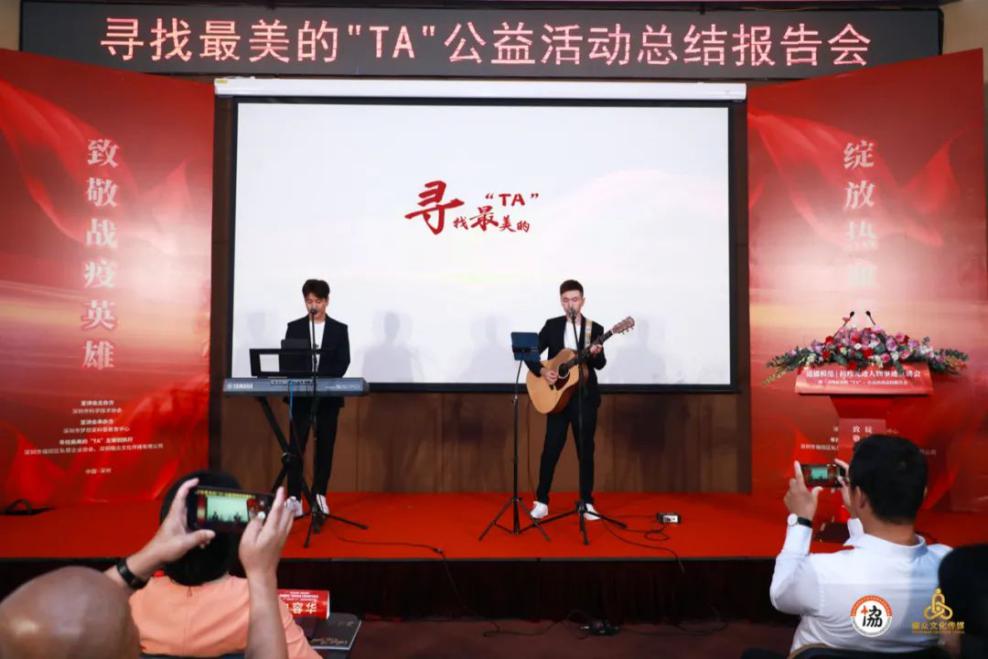 活動(dòng)尾聲,會(huì)場響起一首滿懷敬意及祝愿的歌聲——尋找最美的“TA”公益活動(dòng)主題曲《無名英雄》。這是由畢業(yè)于中國音樂學(xué)院并多次參演央視春晚、與郎朗同臺演奏的孫培軒與民謠吉他創(chuàng)作歌手強(qiáng)曉龍共同親情獻(xiàn)唱的原創(chuàng)戰(zhàn)疫歌曲,現(xiàn)場的各位嘉賓及觀眾無不感動(dòng),感謝無名的英雄們用那堅(jiān)如磐石的雙肩,踐行著初心使命及鏗鏘有力的誓言。