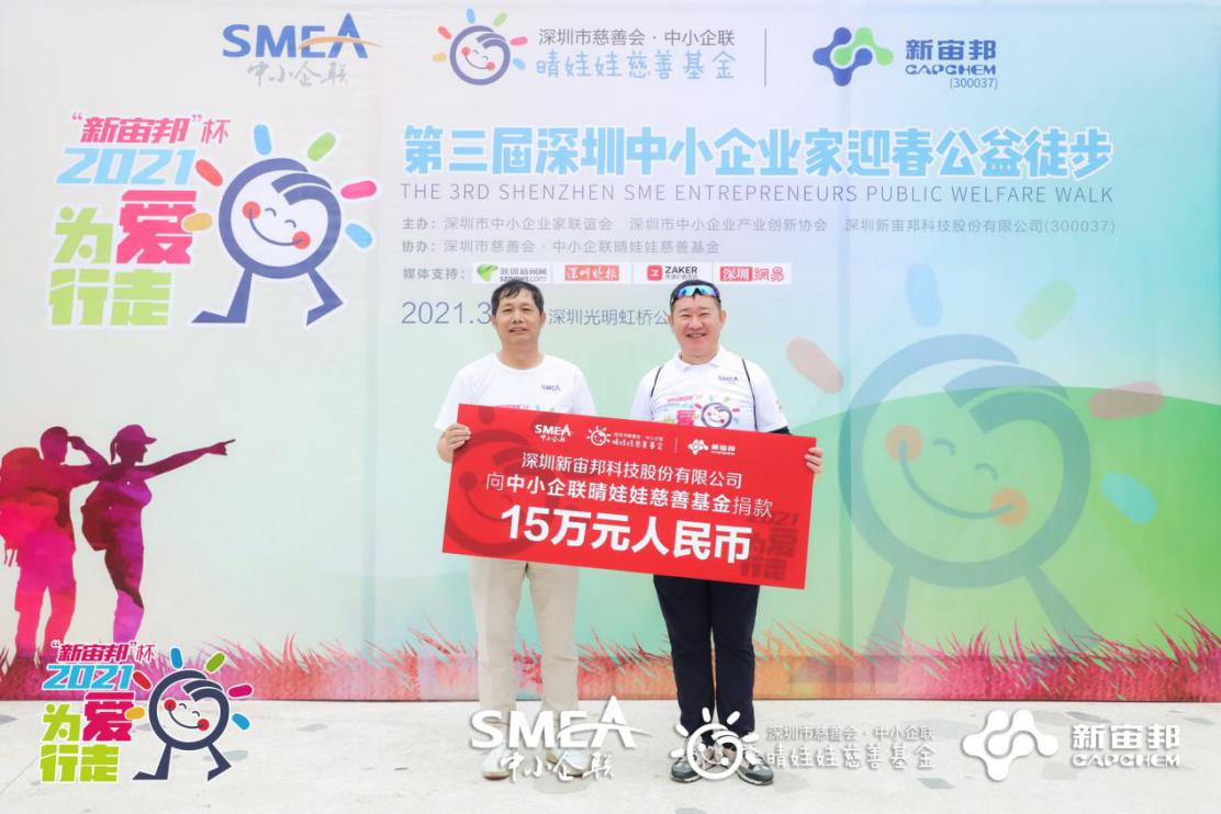 第三屆“為愛行走”活動(dòng)的愛心冠名企業(yè)-中小企聯(lián)副會(huì)長(zhǎng)、深圳新宙邦科技股份有限公司董事長(zhǎng)覃九三向中小企聯(lián)晴娃娃慈善基金捐款15萬元人民幣。