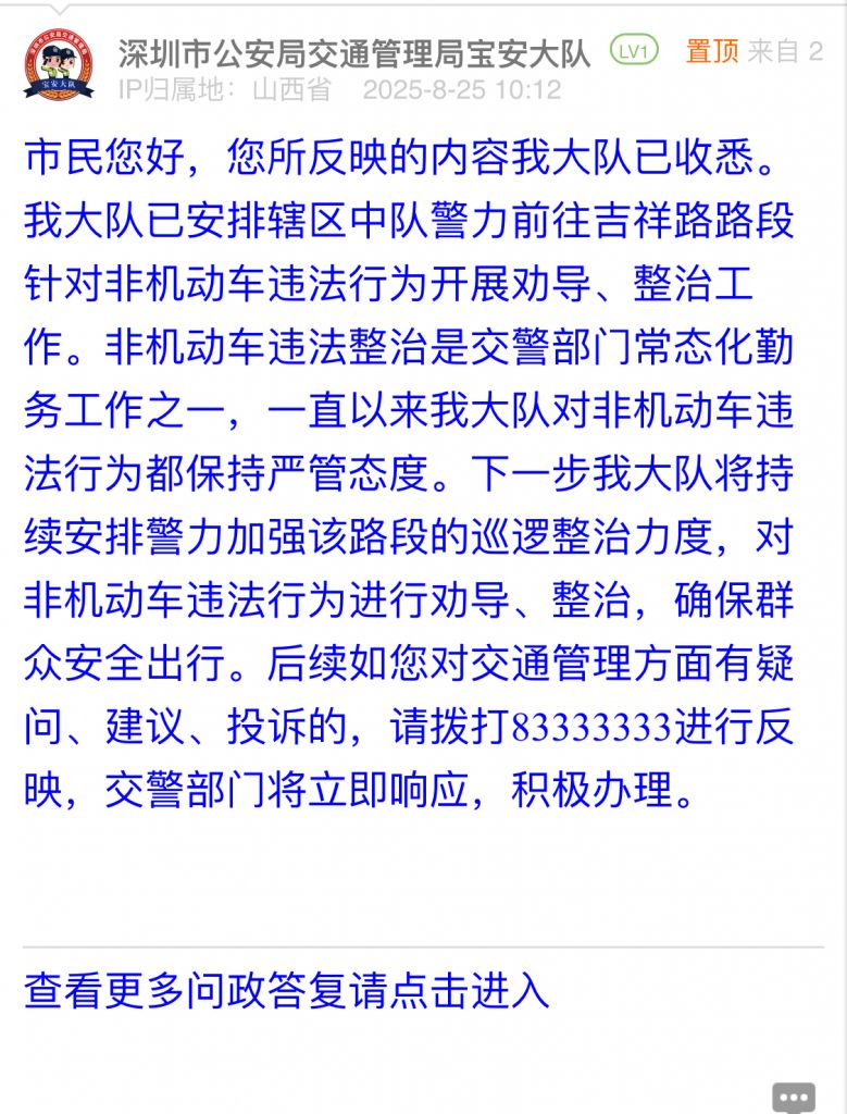 市民您好,您所反映的內(nèi)容我大隊已收悉。我大隊已安排轄區(qū)中隊警力前往吉祥路路段針對非機動車違法行為開展勸導(dǎo)、整治工作。非機動車違法整治是交警部門常態(tài)化勤務(wù)工作之一,一直以來我大隊對非機動車違法行為都保持嚴(yán)管態(tài)度。下一步我大隊將持續(xù)安排警力加強該路段的巡邏整治力度,對非機動車違法行為進行勸導(dǎo)、整治,確保群眾安全出行。后續(xù)如您對交通管理方面有疑問、建議、投訴的,請撥打83333333進行反映,交警部門將立即響應(yīng),積極辦理。