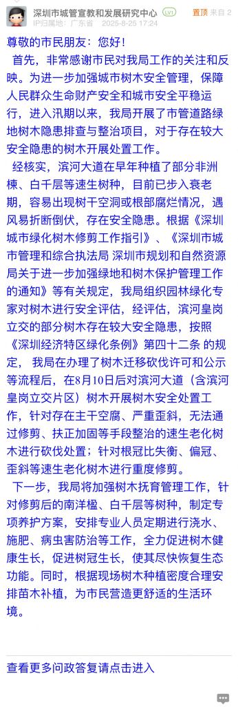 經(jīng)核實,濱河大道在早年種植了部分非洲楝、白千層等速生樹種,目前已步入衰老期,容易出現(xiàn)樹干空洞或根部腐爛情況,遇風(fēng)易折斷倒伏,存在安全隱患。根據(jù)《深圳城市綠化樹木修剪工作指引》、《深圳市城市管理和綜合執(zhí)法局 深圳市規(guī)劃和自然資源局關(guān)于進一步加強綠地和樹木保護管理工作的通知》等有關(guān)規(guī)定,我局組織園林綠化專家對樹木進行安全評估,經(jīng)評估,濱河皇崗立交的部分樹木存在較大安全隱患,按照《深圳經(jīng)濟特區(qū)綠化條例》第四十二條 的規(guī)定, 我局在辦理了樹木遷移砍伐許可和公示等流程后,在8月10日后對濱河大道(含濱河皇崗立交片區(qū))樹木開展樹木安全處置工作,針對存在主干空腐、嚴(yán)重歪斜,無法通過修剪、扶正加固等手段整治的速生老化樹木進行砍伐處置;針對根冠比失衡、偏冠、歪斜等速生老化樹木進行重度修剪。