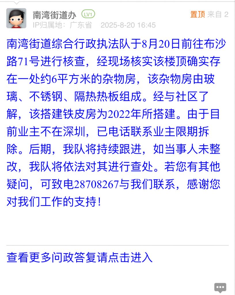 南灣街道綜合行政執(zhí)法隊于8月20日前往布沙路71號進行核查,經(jīng)現(xiàn)場核實該樓頂確實存在一處約6平方米的雜物房,該雜物房由玻璃、不銹鋼、隔熱熱板組成。經(jīng)與社區(qū)了解,該搭建鐵皮房為2022年所搭建。由于目前業(yè)主不在深圳,已電話聯(lián)系業(yè)主限期拆除。后期,我隊將持續(xù)跟進,如當(dāng)事人未整改,我隊將依法對其進行查處。若您有其他疑問,可致電28708267與我們聯(lián)系,感謝您對我們工作的支持!