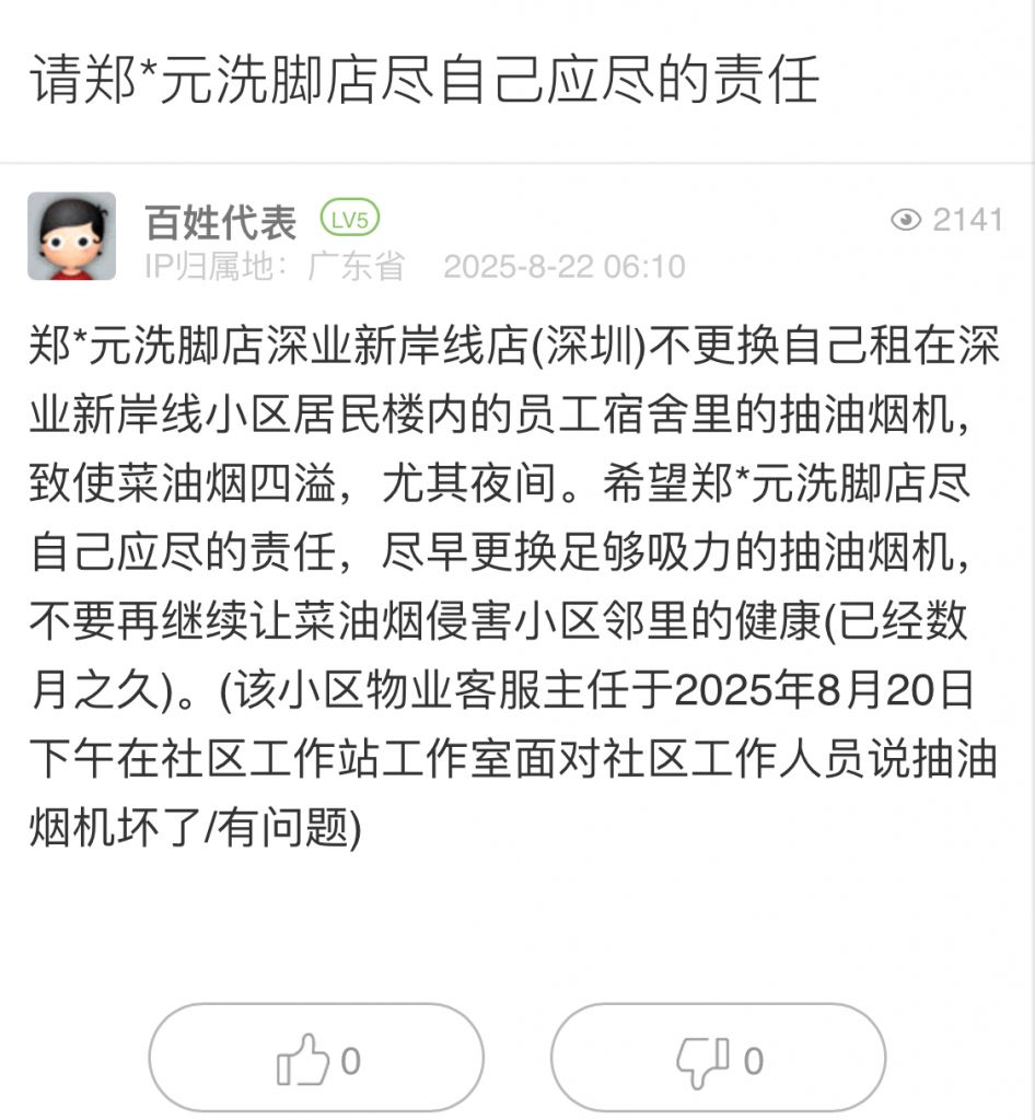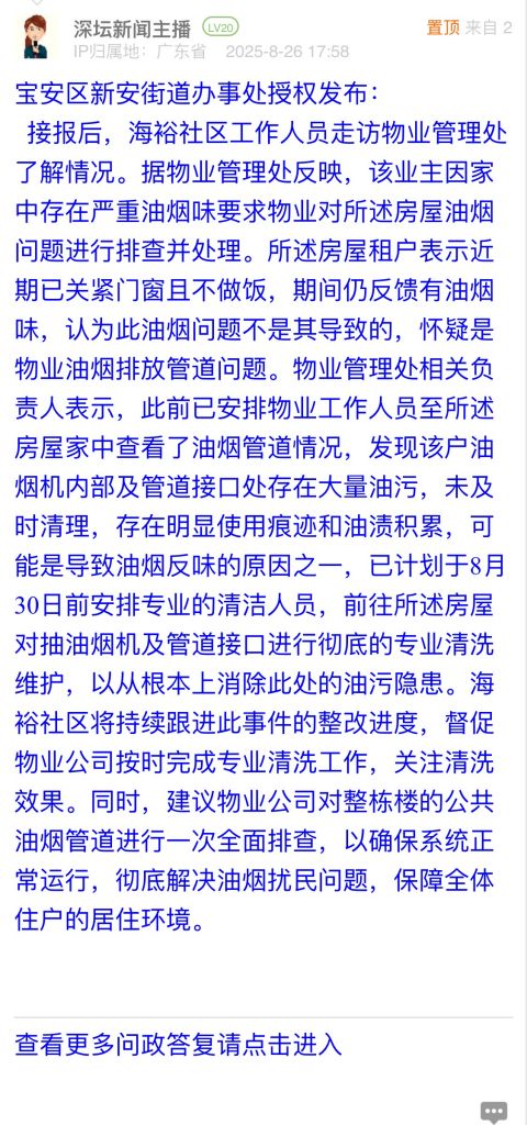 接報后,海裕社區(qū)工作人員走訪物業(yè)管理處了解情況。據(jù)物業(yè)管理處反映,該業(yè)主因家中存在嚴(yán)重油煙味要求物業(yè)對所述房屋油煙問題進行排查并處理。所述房屋租戶表示近期已關(guān)緊門窗且不做飯,期間仍反饋有油煙味,認(rèn)為此油煙問題不是其導(dǎo)致的,懷疑是物業(yè)油煙排放管道問題。物業(yè)管理處相關(guān)負責(zé)人表示,此前已安排物業(yè)工作人員至所述房屋家中查看了油煙管道情況,發(fā)現(xiàn)該戶油煙機內(nèi)部及管道接口處存在大量油污,未及時清理,存在明顯使用痕跡和油漬積累,可能是導(dǎo)致油煙反味的原因之一,已計劃于8月30日前安排專業(yè)的清潔人員,前往所述房屋對抽油煙機及管道接口進行徹底的專業(yè)清洗維護,以從根本上消除此處的油污隱患。海裕社區(qū)將持續(xù)跟進此事件的整改進度,督促物業(yè)公司按時完成專業(yè)清洗工作,關(guān)注清洗效果。同時,建議物業(yè)公司對整棟樓的公共油煙管道進行一次全面排查,以確保系統(tǒng)正常運行,徹底解決油煙擾民問題,保障全體住戶的居住環(huán)境。