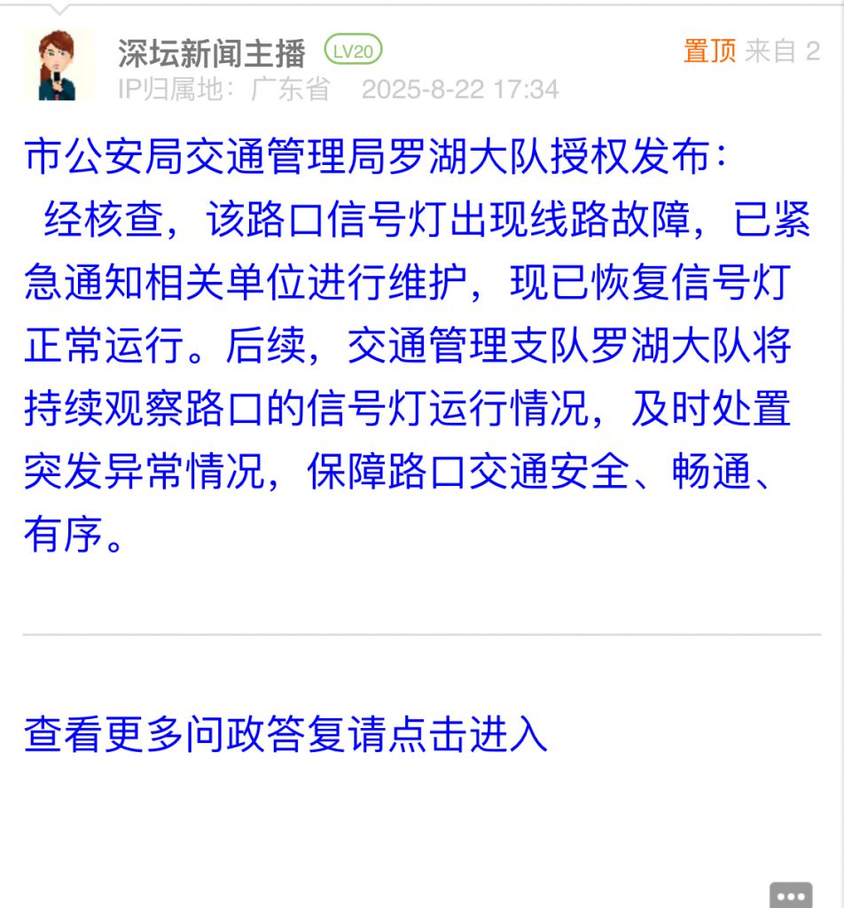 經(jīng)核查,該路口信號燈出現(xiàn)線路故障,已緊急通知相關(guān)單位進行維護,現(xiàn)已恢復(fù)信號燈正常運行。后續(xù),交通管理支隊羅湖大隊將持續(xù)觀察路口的信號燈運行情況,及時處置突發(fā)異常情況,保障路口交通安全、暢通、有序。
