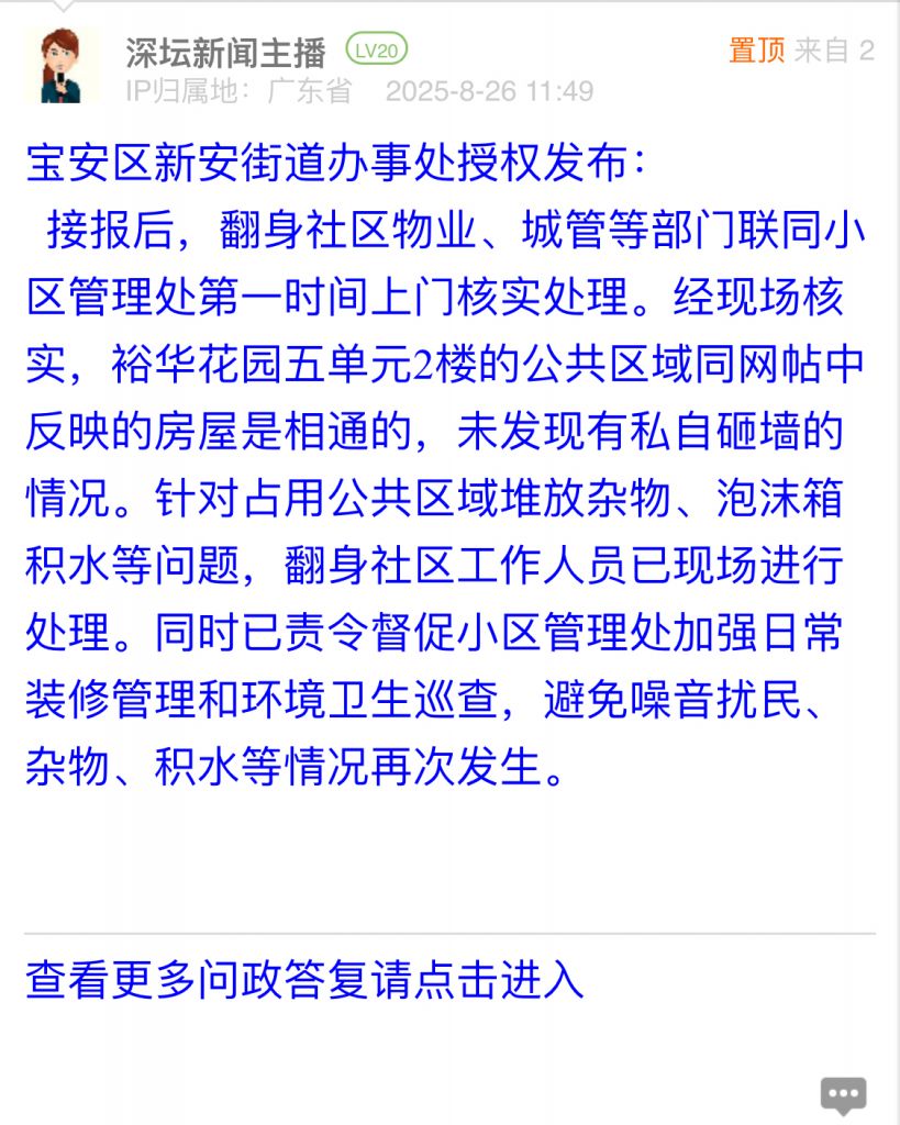 接報后,翻身社區(qū)物業(yè)、城管等部門聯(lián)同小區(qū)管理處第一時間上門核實處理。經(jīng)現(xiàn)場核實,裕華花園五單元2樓的公共區(qū)域同網(wǎng)帖中反映的房屋是相通的,未發(fā)現(xiàn)有私自砸墻的情況。針對占用公共區(qū)域堆放雜物、泡沫箱積水等問題,翻身社區(qū)工作人員已現(xiàn)場進行處理。同時已責(zé)令督促小區(qū)管理處加強日常裝修管理和環(huán)境衛(wèi)生巡查,避免噪音擾民、雜物、積水等情況再次發(fā)生。