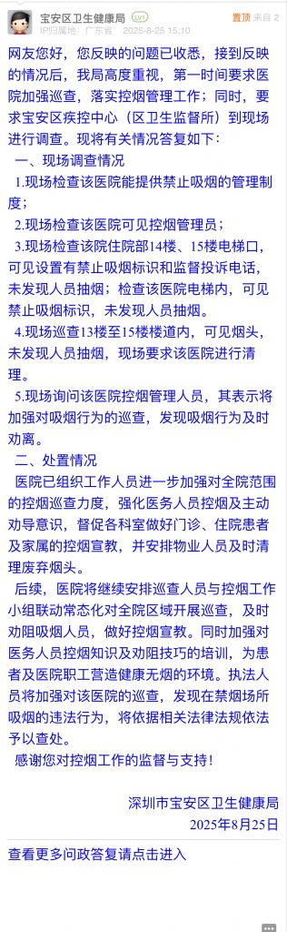 網(wǎng)友您好,您反映的問題已收悉,接到反映的情況后,我局高度重視,第一時間要求醫(yī)院加強巡查,落實控?zé)煿芾砉ぷ鳎煌瑫r,要求寶安區(qū)疾控中心(區(qū)衛(wèi)生監(jiān)督所)到現(xiàn)場進行調(diào)查?,F(xiàn)將有關(guān)情況答復(fù)如下: