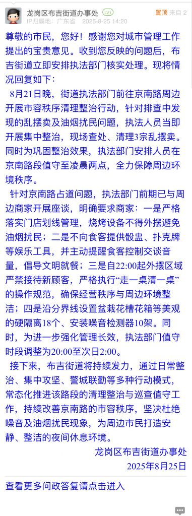 目前,我隊已安排人員夜間對該店定點巡查,下一步,我隊將持續(xù)加強該處市容環(huán)境整治力度,對于多次勸導(dǎo)拒不整改的情況,將對其暫扣相關(guān)經(jīng)營工具。感謝您對城市管理工作的理解與支持!