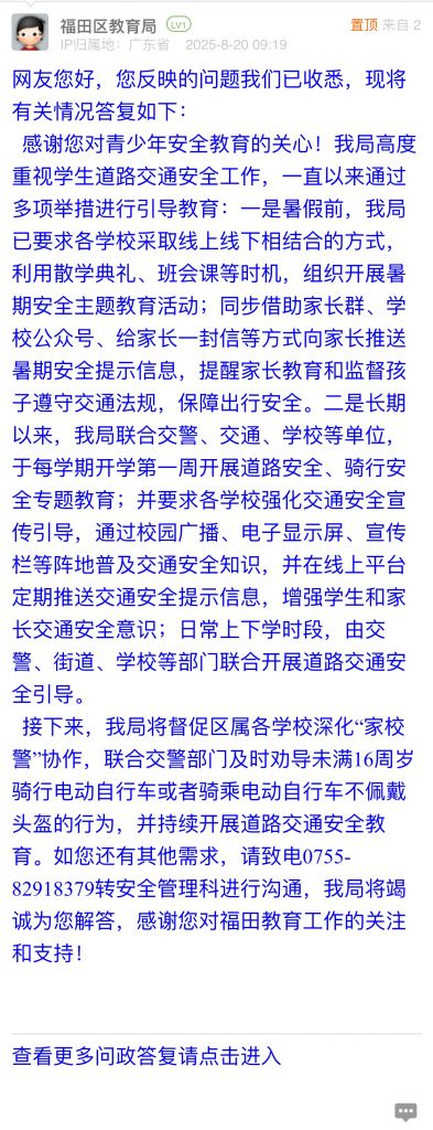 接下來,我局將督促區(qū)屬各學(xué)校深化“家校警”協(xié)作,聯(lián)合交警部門及時勸導(dǎo)未滿16周歲騎行電動自行車或者騎乘電動自行車不佩戴頭盔的行為,并持續(xù)開展道路交通安全教育。如您還有其他需求,請致電0755-82918379轉(zhuǎn)安全管理科進行溝通,我局將竭誠為您解答,感謝您對福田教育工作的關(guān)注和支持!