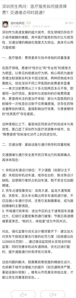 15. 帖文《深圳民生兩問:醫(yī)療服務(wù)如何提質(zhì)降費?交通堵點何時疏通?》