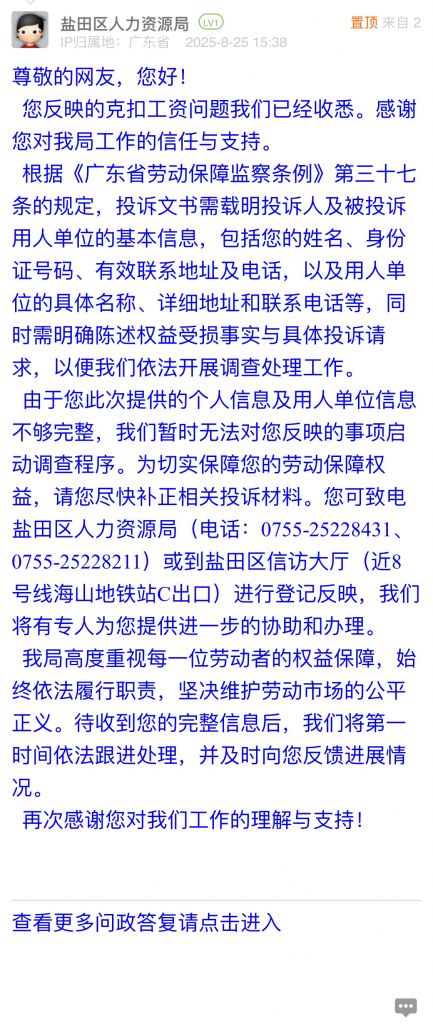 由于您此次提供的個人信息及用人單位信息不夠完整,我們暫時無法對您反映的事項啟動調(diào)查程序。為切實保障您的勞動保障權(quán)益,請您盡快補正相關(guān)投訴材料。您可致電鹽田區(qū)人力資源局(電話:0755-25228431、0755-25228211)或到鹽田區(qū)信訪大廳(近8號線海山地鐵站C出口)進行登記反映,我們將有專人為您提供進一步的協(xié)助和辦理。