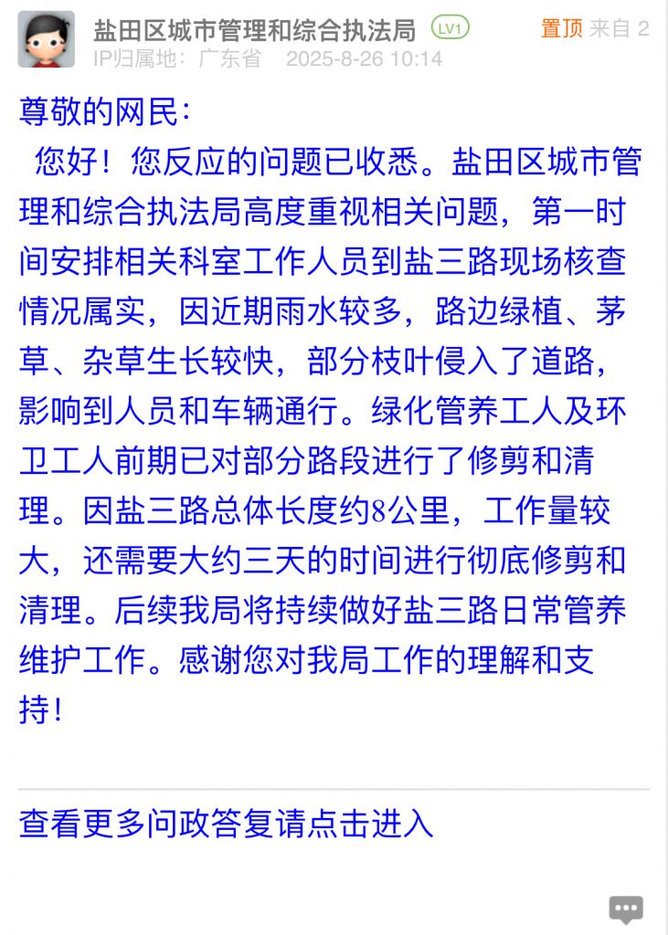 您好!您反應(yīng)的問題已收悉。鹽田區(qū)城市管理和綜合執(zhí)法局高度重視相關(guān)問題,第一時間安排相關(guān)科室工作人員到鹽三路現(xiàn)場核查情況屬實,因近期雨水較多,路邊綠植、茅草、雜草生長較快,部分枝葉侵入了道路,影響到人員和車輛通行。綠化管養(yǎng)工人及環(huán)衛(wèi)工人前期已對部分路段進行了修剪和清理。因鹽三路總體長度約8公里,工作量較大,還需要大約三天的時間進行徹底修剪和清理。后續(xù)我局將持續(xù)做好鹽三路日常管養(yǎng)維護工作。感謝您對我局工作的理解和支持!