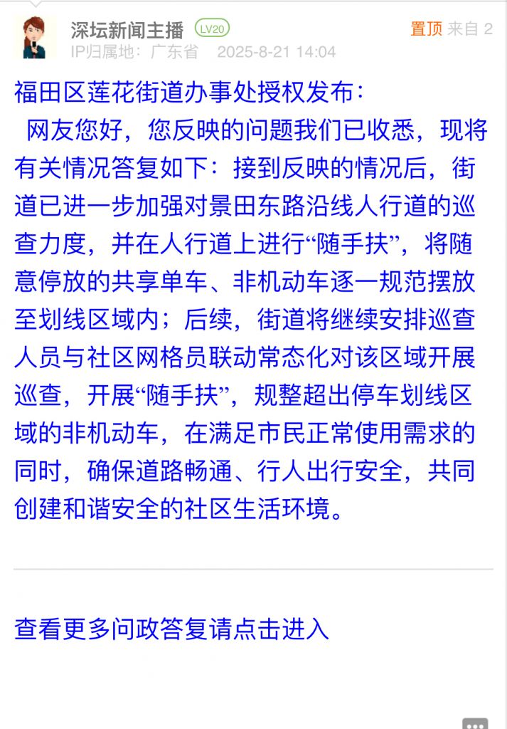 網(wǎng)友您好,您反映的問題我們已收悉,現(xiàn)將有關(guān)情況答復(fù)如下:接到反映的情況后,街道已進一步加強對景田東路沿線人行道的巡查力度,并在人行道上進行“隨手扶”,將隨意停放的共享單車、非機動車逐一規(guī)范擺放至劃線區(qū)域內(nèi);后續(xù),街道將繼續(xù)安排巡查人員與社區(qū)網(wǎng)格員聯(lián)動常態(tài)化對該區(qū)域開展巡查,開展“隨手扶”,規(guī)整超出停車劃線區(qū)域的非機動車,在滿足市民正常使用需求的同時,確保道路暢通、行人出行安全,共同創(chuàng)建和諧安全的社區(qū)生活環(huán)境。