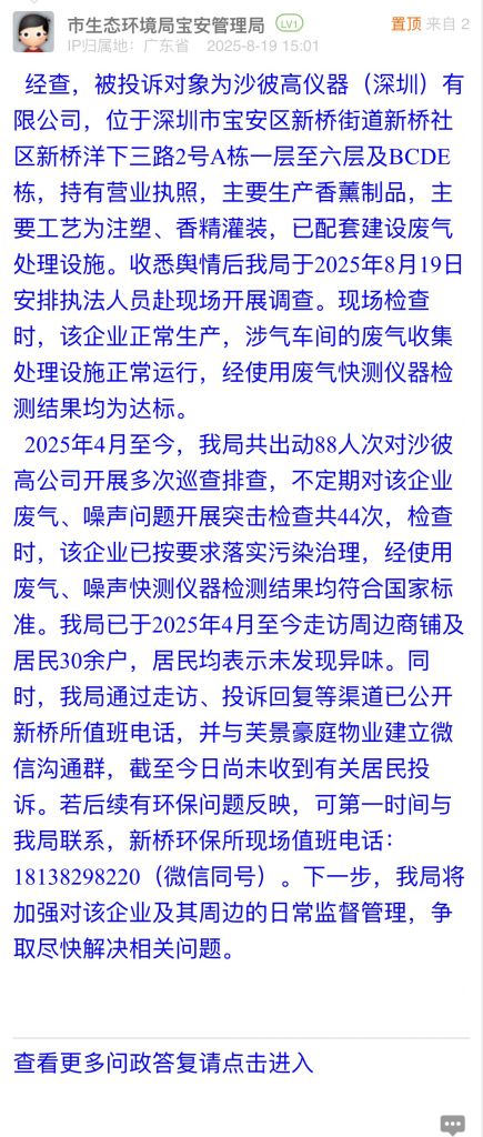 經(jīng)查,被投訴對象為沙彼高儀器(深圳)有限公司,位于深圳市寶安區(qū)新橋街道新橋社區(qū)新橋洋下三路2號A棟一層至六層及BCDE棟,持有營業(yè)執(zhí)照,主要生產(chǎn)香薰制品,主要工藝為注塑、香精灌裝,已配套建設(shè)廢氣處理設(shè)施。收悉輿情后我局于2025年8月19日安排執(zhí)法人員赴現(xiàn)場開展調(diào)查?,F(xiàn)場檢查時,該企業(yè)正常生產(chǎn),涉氣車間的廢氣收集處理設(shè)施正常運行,經(jīng)使用廢氣快測儀器檢測結(jié)果均為達標(biāo)。