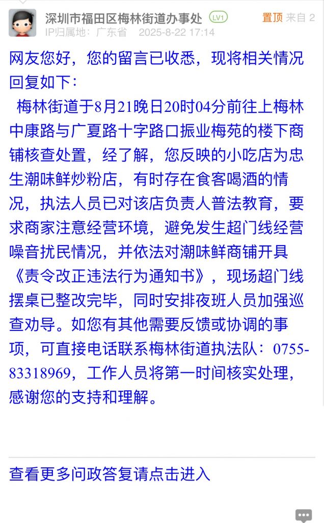 梅林街道于8月21晚日20時04分前往上梅林中康路與廣夏路十字路口振業(yè)梅苑的樓下商鋪核查處置,經(jīng)了解,您反映的小吃店為忠生潮味鮮炒粉店,有時存在食客喝酒的情況,執(zhí)法人員已對該店負責(zé)人普法教育,要求商家注意經(jīng)營環(huán)境,避免發(fā)生超門線經(jīng)營噪音擾民情況,并依法對潮味鮮商鋪開具《責(zé)令改正違法行為通知書》,現(xiàn)場超門線擺桌已整改完畢,同時安排夜班人員加強巡查勸導(dǎo)。如您有其他需要反饋或協(xié)調(diào)的事項,可直接電話聯(lián)系梅林街道執(zhí)法隊:0755-83318969,工作人員將第一時間核實處理,感謝您的支持和理解。