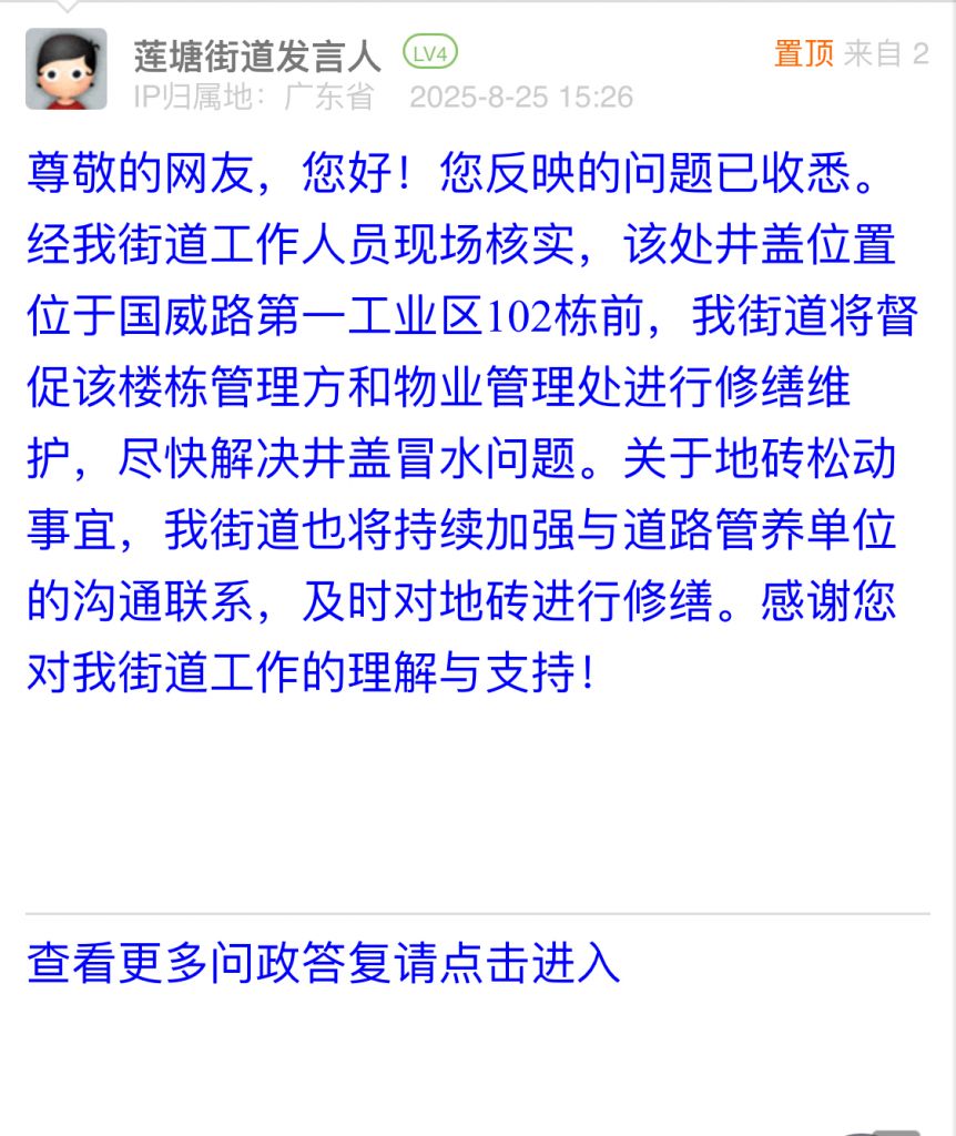尊敬的網(wǎng)友,您好!您反映的問題已收悉。經(jīng)我街道工作人員現(xiàn)場核實,該處井蓋位置位于國威路第一工業(yè)區(qū)102棟前,我街道將督促該樓棟管理方和物業(yè)管理處進行修繕維護,盡快解決井蓋冒水問題。關(guān)于地磚松動事宜,我街道也將持續(xù)加強與道路管養(yǎng)單位的溝通聯(lián)系,及時對地磚進行修繕。感謝您對我街道工作的理解與支持!