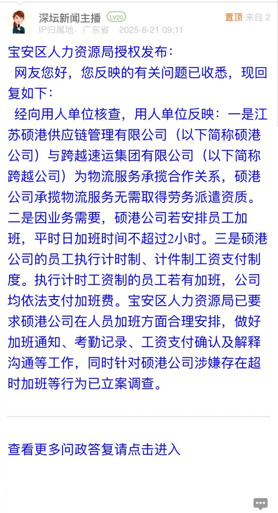 經(jīng)向用人單位核查,用人單位反映:一是江蘇碩港供應(yīng)鏈管理有限公司(以下簡稱碩港公司)與跨越速運集團有限公司(以下簡稱跨越公司)為物流服務(wù)承攬合作關(guān)系,碩港公司承攬物流服務(wù)無需取得勞務(wù)派遣資質(zhì)。二是因業(yè)務(wù)需要,碩港公司若安排員工加班,平時日加班時間不超過2小時。三是碩港公司的員工執(zhí)行計時制、計件制工資支付制度。執(zhí)行計時工資制的員工若有加班,公司均依法支付加班費。寶安區(qū)人力資源局已要求碩港公司在人員加班方面合理安排,做好加班通知、考勤記錄、工資支付確認(rèn)及解釋溝通等工作,同時針對碩港公司涉嫌存在超時加班等行為已立案調(diào)查。
