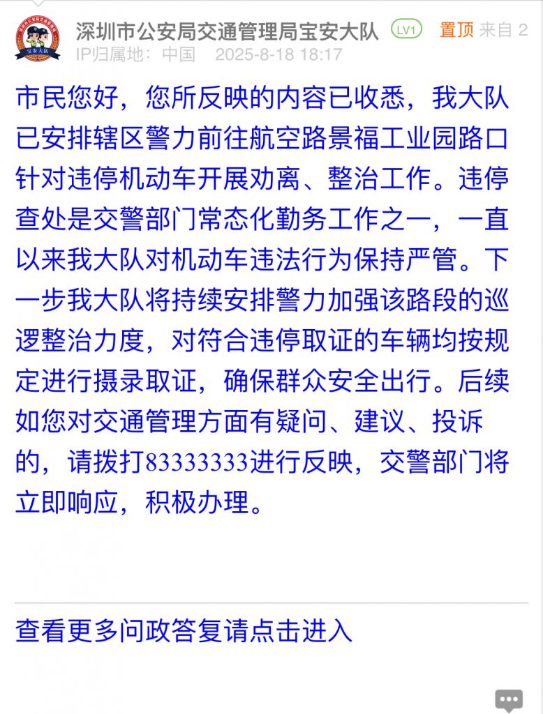 市民您好,您所反映的內(nèi)容已收悉,我大隊已安排轄區(qū)警力前往航空路景福工業(yè)園路口針對違停機動車開展勸離、整治工作。違停查處是交警部門常態(tài)化勤務(wù)工作之一,一直以來我大隊對機動車違法行為保持嚴(yán)管。下一步我大隊將持續(xù)安排警力加強該路段的巡邏整治力度,對符合違停取證的車輛均按規(guī)定進行攝錄取證,確保群眾安全出行。后續(xù)如您對交通管理方面有疑問、建議、投訴的,請撥打83333333進行反映,交警部門將立即響應(yīng),積極辦理。