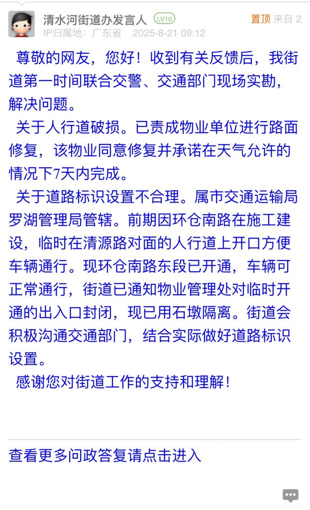 關(guān)于道路標(biāo)識設(shè)置不合理。屬市交通運輸局羅湖管理局管轄。前期因環(huán)倉南路在施工建設(shè),臨時在清源路對面的人行道上開口方便車輛通行?,F(xiàn)環(huán)倉南路東段已開通,車輛可正常通行,街道已通知物業(yè)管理處對臨時開通的出入口封閉,現(xiàn)已用石墩隔離。街道會積極溝通交通部門,結(jié)合實際做好道路標(biāo)識設(shè)置。