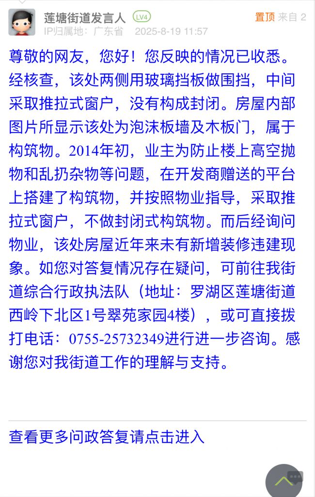 尊敬的網(wǎng)友,您好!您反映的情況已收悉。經(jīng)核查,該處兩側(cè)用玻璃擋板做圍擋,中間采取推拉式窗戶,沒有構(gòu)成封閉。房屋內(nèi)部圖片所顯示該處為泡沫板墻及木板門,屬于構(gòu)筑物。2014年初,業(yè)主為防止樓上高空拋物和亂扔雜物等問題,在開發(fā)商贈送的平臺上搭建了構(gòu)筑物,并按照物業(yè)指導(dǎo),采取推拉式窗戶,不做封閉式構(gòu)筑物。而后經(jīng)詢問物業(yè),該處房屋近年來未有新增裝修違建現(xiàn)象。如您對答復(fù)情況存在疑問,可前往我街道綜合行政執(zhí)法隊(地址:羅湖區(qū)蓮塘街道西嶺下北區(qū)1號翠苑家園4樓),或可直接撥打電話:0755-25732349進行進一步咨詢。感謝您對我街道工作的理解與支持。