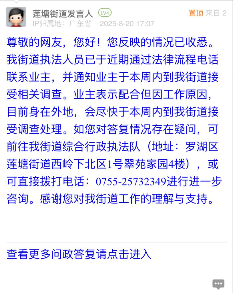 尊敬的網(wǎng)友,您好!您反映的情況已收悉。我街道執(zhí)法人員已于近期通過法律流程電話聯(lián)系業(yè)主,并通知業(yè)主于本周內(nèi)到我街道接受相關(guān)調(diào)查。業(yè)主表示配合但因工作原因,目前身在外地,會盡快于本周內(nèi)到我街道接受調(diào)查處理。如您對答復(fù)情況存在疑問,可前往我街道綜合行政執(zhí)法隊(地址:羅湖區(qū)蓮塘街道西嶺下北區(qū)1號翠苑家園4樓),或可直接撥打電話:0755-25732349進行進一步咨詢。感謝您對我街道工作的理解與支持。