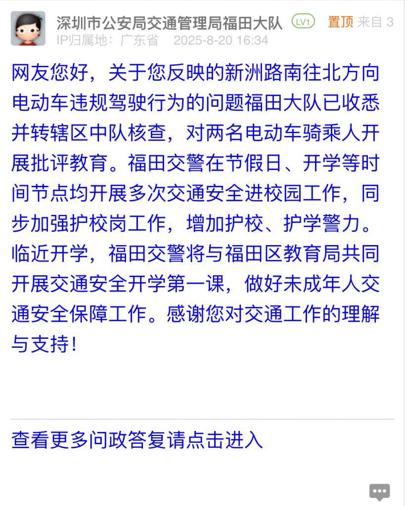 網(wǎng)友您好,關(guān)于您反映的新洲路南往北方向電動車違規(guī)駕駛行為的問題福田大隊已收悉并轉(zhuǎn)轄區(qū)中隊核查,對兩名電動車騎乘人開展批評教育。福田交警在節(jié)假日、開學(xué)等時間節(jié)點均開展多次交通安全進校園工作,同步加強護校崗工作,增加護校、護學(xué)警力。臨近開學(xué),福田交警將與福田區(qū)教育局共同開展交通安全開學(xué)第一課,做好未成年人交通安全保障工作。感謝您對交通工作的理解與支持!