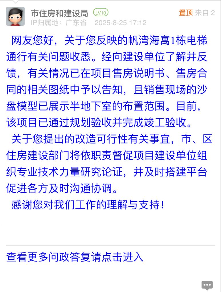 網(wǎng)友您好,關(guān)于您反映的帆灣海寓1棟電梯通行有關(guān)問題收悉。經(jīng)向建設(shè)單位了解并反饋,有關(guān)情況已在項目售房說明書、售房合同的相關(guān)圖紙中予以告知,且銷售現(xiàn)場的沙盤模型已展示半地下室的布置范圍。目前,該項目已通過規(guī)劃驗收并完成竣工驗收。