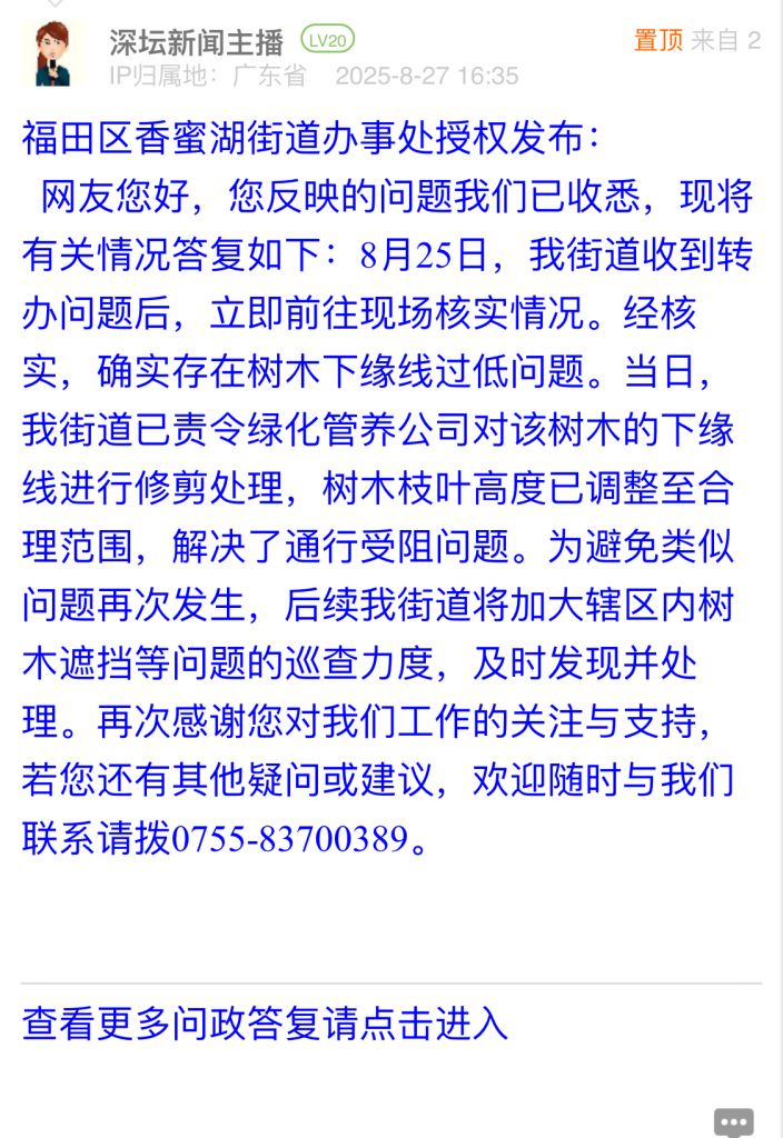 網(wǎng)友您好,您反映的問題我們已收悉,現(xiàn)將有關(guān)情況答復(fù)如下:8月25日,我街道收到轉(zhuǎn)辦問題后,立即前往現(xiàn)場核實情況。經(jīng)核實,確實存在樹木下緣線過低問題。當(dāng)日,我街道已責(zé)令綠化管養(yǎng)公司對該樹木的下緣線進行修剪處理,樹木枝葉高度已調(diào)整至合理范圍,解決了通行受阻問題。為避免類似問題再次發(fā)生,后續(xù)我街道將加大轄區(qū)內(nèi)樹木遮擋等問題的巡查力度,及時發(fā)現(xiàn)并處理。再次感謝您對我們工作的關(guān)注與支持,若您還有其他疑問或建議,歡迎隨時與我們聯(lián)系請撥0755-83700389。