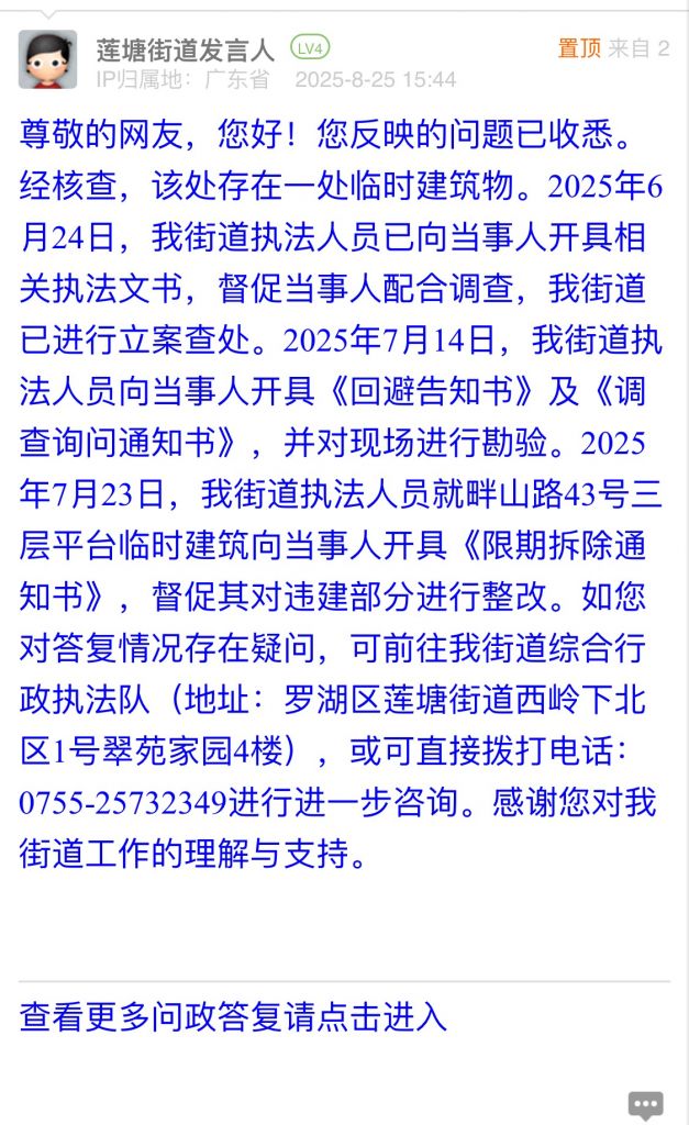尊敬的網(wǎng)友,您好!您反映的問題已收悉。經(jīng)核查,該處存在一處臨時建筑物。2025年6月24日,我街道執(zhí)法人員已向當(dāng)事人開具相關(guān)執(zhí)法文書,督促當(dāng)事人配合調(diào)查,我街道已進行立案查處。2025年7月14日,我街道執(zhí)法人員向當(dāng)事人開具《回避告知書》及《調(diào)查詢問通知書》,并對現(xiàn)場進行勘驗。2025年7月23日,我街道執(zhí)法人員就畔山路43號三層平臺臨時建筑向當(dāng)事人開具《限期拆除通知書》,督促其對違建部分進行整改。如您對答復(fù)情況存在疑問,可前往我街道綜合行政執(zhí)法隊(地址:羅湖區(qū)蓮塘街道西嶺下北區(qū)1號翠苑家園4樓),或可直接撥打電話:0755-25732349進行進一步咨詢。感謝您對我街道工作的理解與支持。