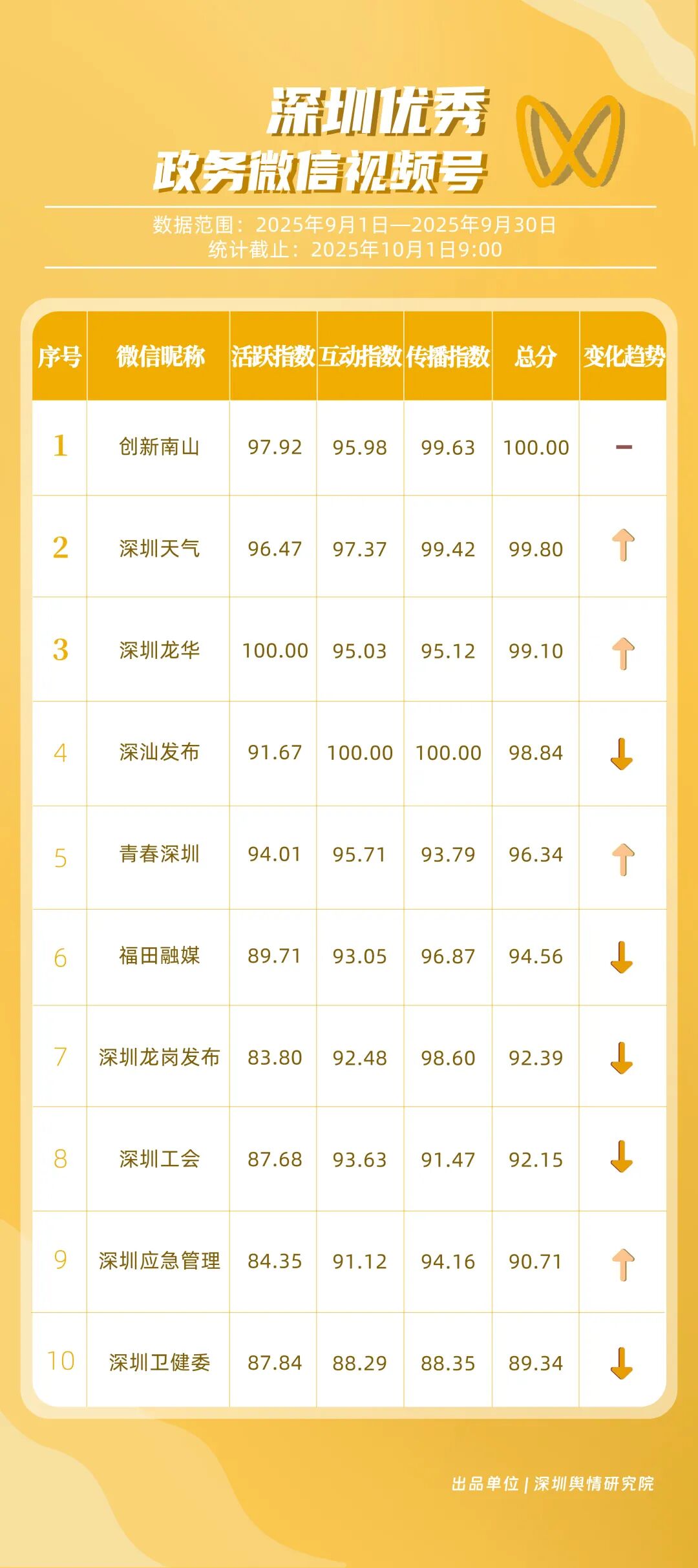 9月,深圳政務新媒體矩陣持續(xù)優(yōu)化內(nèi)容生態(tài),各單位依托平臺特色深化服務效能,南山區(qū)、市衛(wèi)生健康委員會、市氣象局(臺)、龍崗區(qū)、福田區(qū)、龍華區(qū)、深汕特別合作區(qū)、市應急管理局、中國共產(chǎn)主義青年團深圳市委員會、光明區(qū)的新媒體矩陣入選“深圳優(yōu)秀政務新媒體矩陣”榜單。9月,南山區(qū)在短視頻平臺表現(xiàn)突出,抖音、微信視頻號平臺均獲滿分;市衛(wèi)生健康委員會輸出深度內(nèi)容,位列榜單第二;市氣象局(臺)新媒體矩陣居于榜單第三,在9月發(fā)布臺風相關天氣提醒,獲得公眾廣泛關注。此外,龍崗區(qū)、福田區(qū)、龍華區(qū)、深汕特別合作區(qū)新媒體矩陣持續(xù)推出優(yōu)質(zhì)內(nèi)容,共同展現(xiàn)了深圳在塑造現(xiàn)代化形象、提升數(shù)字治理能力上的創(chuàng)新引領作用。
