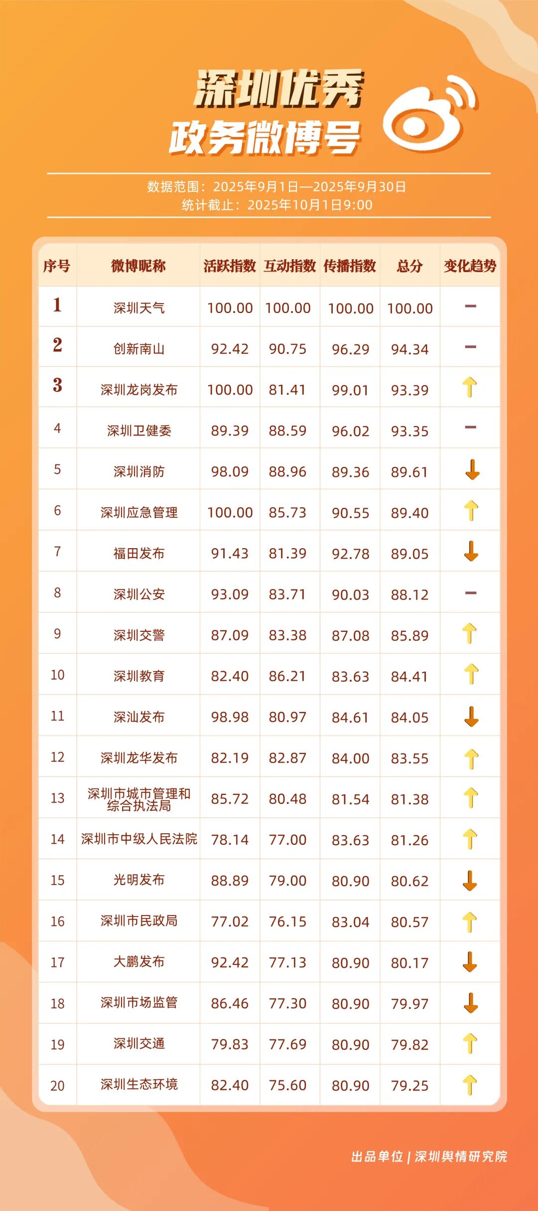 9月,20個賬號入選“優(yōu)秀政務微博號”榜單,其中包括:“深圳天氣”“創(chuàng)新南山”“深圳龍崗發(fā)布”“深圳衛(wèi)健委”“深圳消防”“深圳應急管理”“福田發(fā)布”“深圳公安”“深圳交警”“深圳教育”等。其中,“深圳天氣”蟬聯(lián)榜首,尤其9月出現(xiàn)臺風天氣,賬號受關注度再提升;“創(chuàng)新南山”賬號以多維度內(nèi)容策略實現(xiàn)傳播效能提升,其內(nèi)容中與歌手周深的聯(lián)動也成為一大亮點,獲得了較好傳播效果,以94.34分排名榜單第二;“深圳龍崗發(fā)布”“深圳衛(wèi)健委”兩賬號得分均在93分以上,在區(qū)域宣傳、內(nèi)容科普方向發(fā)力。上榜優(yōu)秀微博賬號展現(xiàn)出較高的內(nèi)容創(chuàng)新能力,以年輕化語態(tài)構建傳播體系,形成兼具專業(yè)性與傳播力的優(yōu)秀案例。