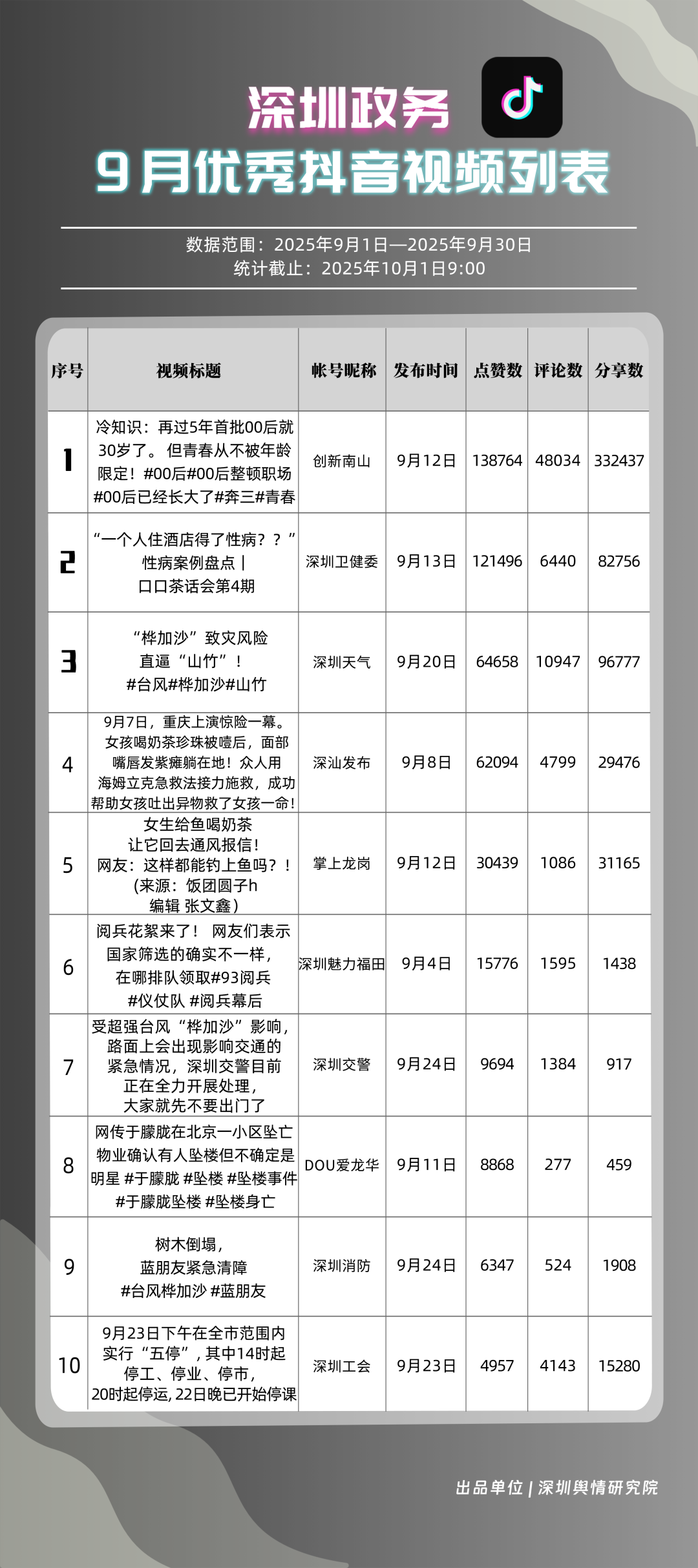 9月,獲得“優(yōu)秀政務抖音號”稱號的是“創(chuàng)新南山”“深圳天氣”“深圳衛(wèi)健委”“深圳魅力福田”“深汕發(fā)布”“掌上龍崗”“DOU愛龍華”“深圳工會”“青春深圳”“深圳交警”?!皠?chuàng)新南山”以一條有關“青春不被年齡限定”的視頻獲得超34萬次轉發(fā),超14萬次點贊,助力其在抖音榜單居于榜首;“深圳天氣”多條臺風相關視頻吸引大量網(wǎng)民關注、互動,在抖音平臺得分超98分;“深圳衛(wèi)健委”“深圳魅力福田”“深汕發(fā)布”等賬號緊隨其后,得分均在92分以上。上榜的優(yōu)秀政務抖音號以“有溫度”的敘事表達,將宣傳、服務內(nèi)容轉化為網(wǎng)民喜聞樂見的視頻,收獲高點贊、高轉發(fā)的流量實績,更在評論區(qū)形成了良性互動生態(tài),深度運營收獲了較好成果。