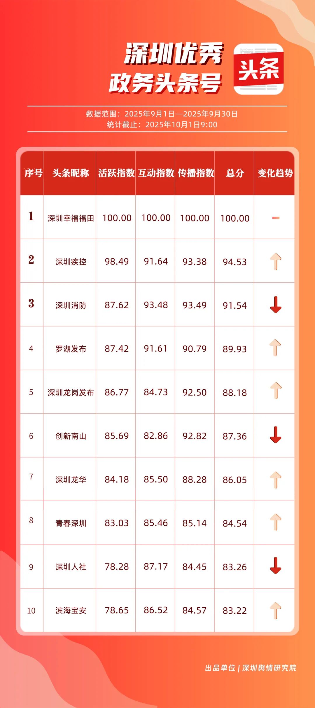 9月,“深圳衛(wèi)健委”“深圳龍崗發(fā)布”“幸福福田”“i深圳”“青春深圳”“深圳工會”“深圳教育”“深圳交通”“創(chuàng)新南山”“深圳應急管理”等30個政務微信公眾號榮登“深圳優(yōu)秀政務微信公眾號”榜單。9月,“深圳衛(wèi)健委”以總分100.00的成績蟬聯(lián)榜單首位,其憑借突破常規(guī)視角的選題,解讀專業(yè)健康知識,引發(fā)大量網(wǎng)民共鳴,內(nèi)容質(zhì)量與傳播力形成雙向賦能;“深圳龍崗發(fā)布”以總分93.24位居第二,聚焦區(qū)域民生服務升級等動態(tài),信息觸達率不斷提升;“幸福福田”圍繞商圈經(jīng)濟復蘇、文化節(jié)慶活動等主題開展系列宣傳,增強區(qū)域活力展示,位列第三;“i深圳”“青春深圳”“深圳工會”等也持續(xù)優(yōu)化賬號內(nèi)容,通過實用信息推送強化政務服務定位。