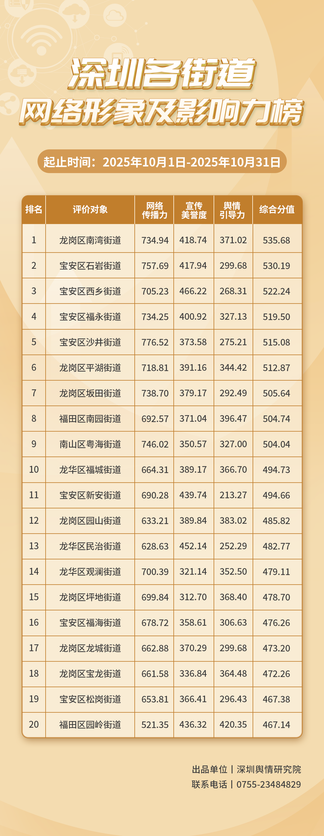2025年10月,共有20個街道登上《深圳各街道網(wǎng)絡(luò)形象及影響力榜》,分別是:龍崗區(qū)南灣街道、寶安區(qū)石巖街道、寶安區(qū)西鄉(xiāng)街道、寶安區(qū)福永街道、寶安區(qū)沙井街道、龍崗區(qū)平湖街道、龍崗區(qū)坂田街道、福田區(qū)南園街道、南山區(qū)粵海街道、龍華區(qū)福城街道、寶安區(qū)新安街道、龍崗區(qū)園山街道、龍華區(qū)民治街道、龍華區(qū)觀瀾街道、龍崗區(qū)坪地街道、寶安區(qū)福海街道、龍崗區(qū)龍城街道、龍崗區(qū)寶龍街道、寶安區(qū)松崗街道、福田區(qū)園嶺街道。