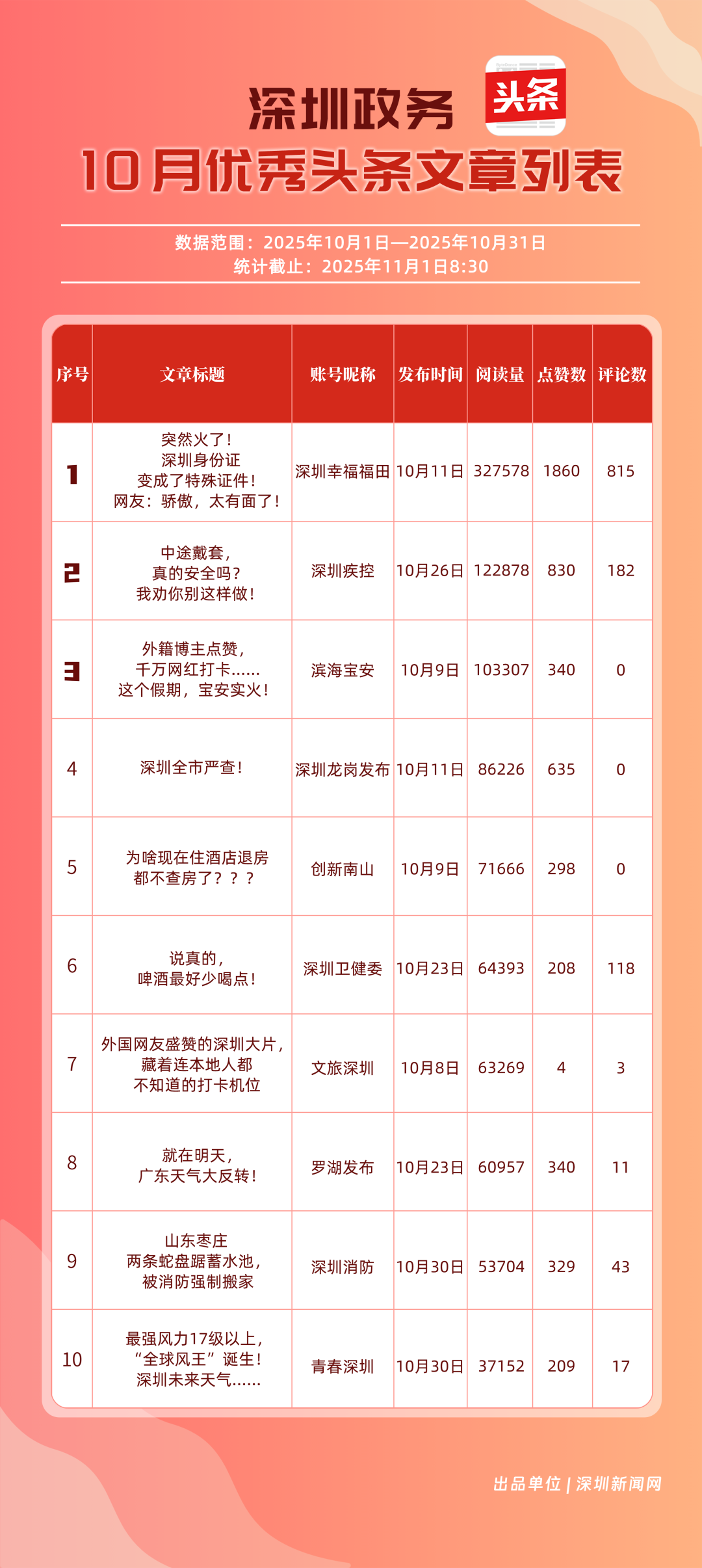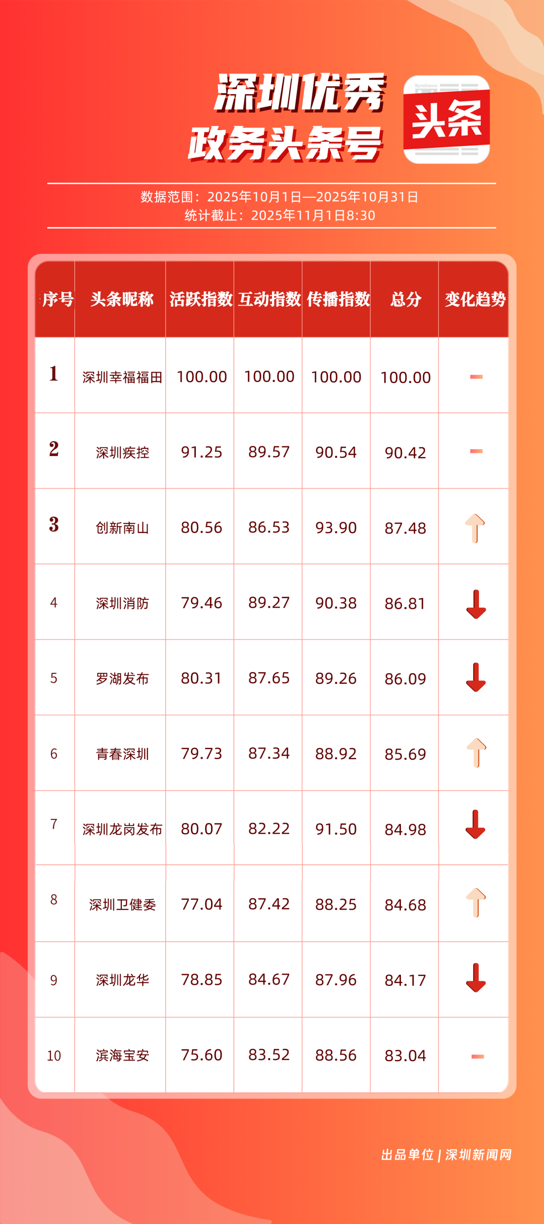 10月,“深圳幸福福田”“深圳疾控”“創(chuàng)新南山”“深圳消防”“羅湖發(fā)布”“青春深圳”“深圳龍崗發(fā)布”“深圳衛(wèi)健委”“深圳龍華”“濱海寶安”共10個政務(wù)頭條號入選“優(yōu)秀政務(wù)頭條號”榜單?!吧钲谛腋8L铩痹诨钴S、互動、傳播均收獲較好成果,蟬聯(lián)榜首;“深圳疾控”得分超90分,持續(xù)發(fā)布民生健康類內(nèi)容,為市民健康保駕護航;“創(chuàng)新南山”內(nèi)容創(chuàng)作緊扣民生與區(qū)域特色,位列榜單第三名?!吧钲谙馈薄傲_湖發(fā)布”等賬號也位列榜單前列,成為區(qū)域政務(wù)新媒體內(nèi)容創(chuàng)新、信息傳遞的標(biāo)桿。