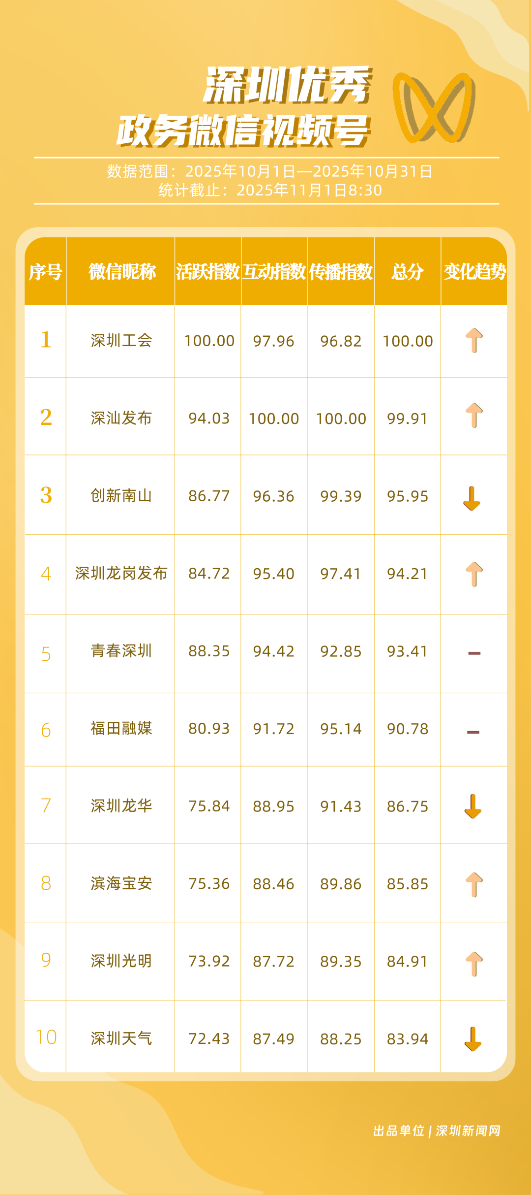2025年10月期《深圳優(yōu)秀政務(wù)新媒體矩陣》正式發(fā)布,上榜矩陣以深度創(chuàng)新的傳播思路與精細化的服務(wù)持續(xù)領(lǐng)跑,為政務(wù)新媒體行業(yè)貢獻了可復(fù)制的實踐經(jīng)驗,深化政務(wù)信息與公眾喜好的精準(zhǔn)對接,為深圳政務(wù)新媒體高質(zhì)量發(fā)展注入新動能與新活力。