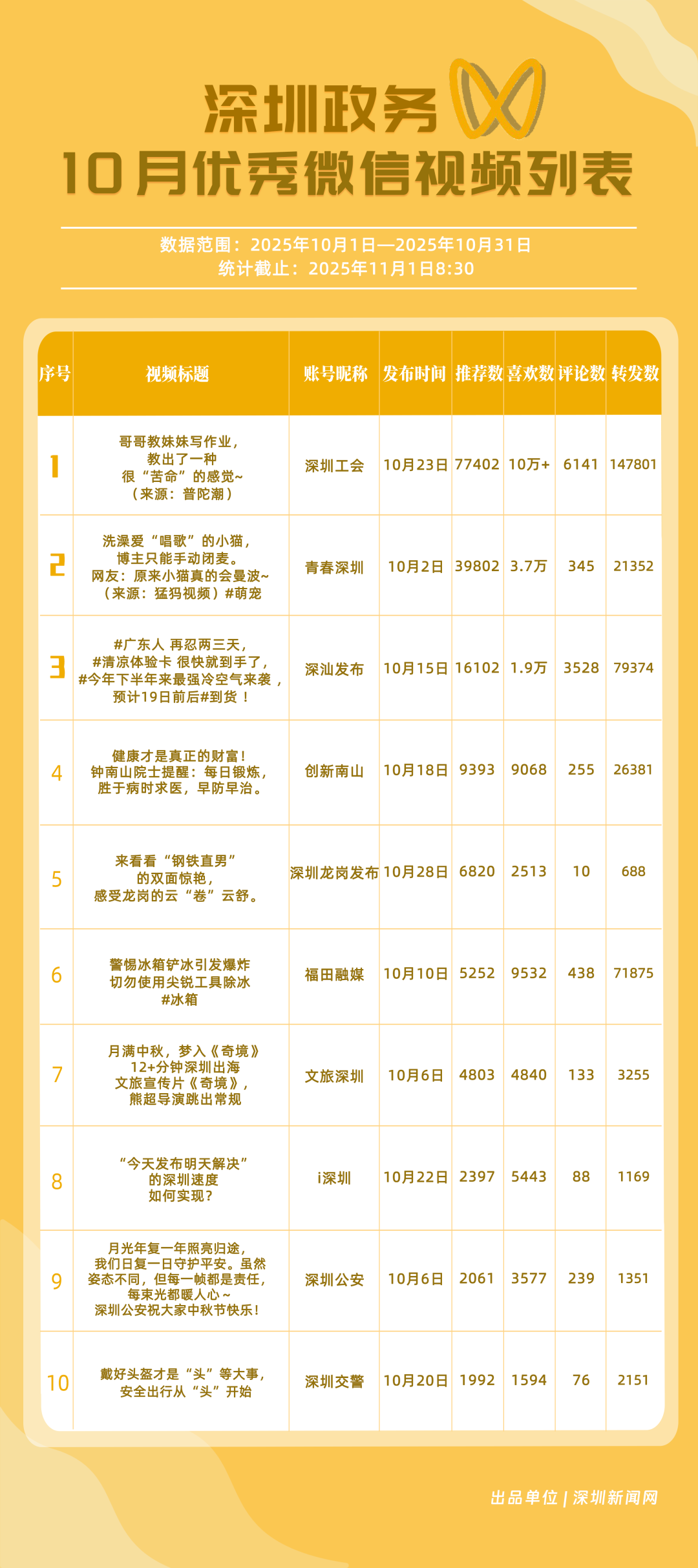 10月,“深圳工會”“深汕發(fā)布”“創(chuàng)新南山”“深圳龍崗發(fā)布”“青春深圳”“福田融媒”“深圳龍華”“濱海寶安”“深圳光明”“深圳天氣”上榜“優(yōu)秀政務(wù)微信視頻號”。其中,“深圳工會”一條有關(guān)教寫作業(yè)教出“命苦感”的視頻吸引大量網(wǎng)民關(guān)注,獲得超10萬次喜歡,助推其位列榜單第一名;“深汕發(fā)布”積極傳播降溫、臺風(fēng)等民生信息,以99.91分位列榜單第二名;“創(chuàng)新南山”和“深圳龍崗發(fā)布”得分在95分左右,內(nèi)容突出區(qū)域成績與創(chuàng)新活力,實現(xiàn)了政務(wù)服務(wù)與傳播效果的雙贏。上榜賬號不斷強化區(qū)域動態(tài)與民生服務(wù)的傳播,在政務(wù)新媒體賽道形成示范效應(yīng)。