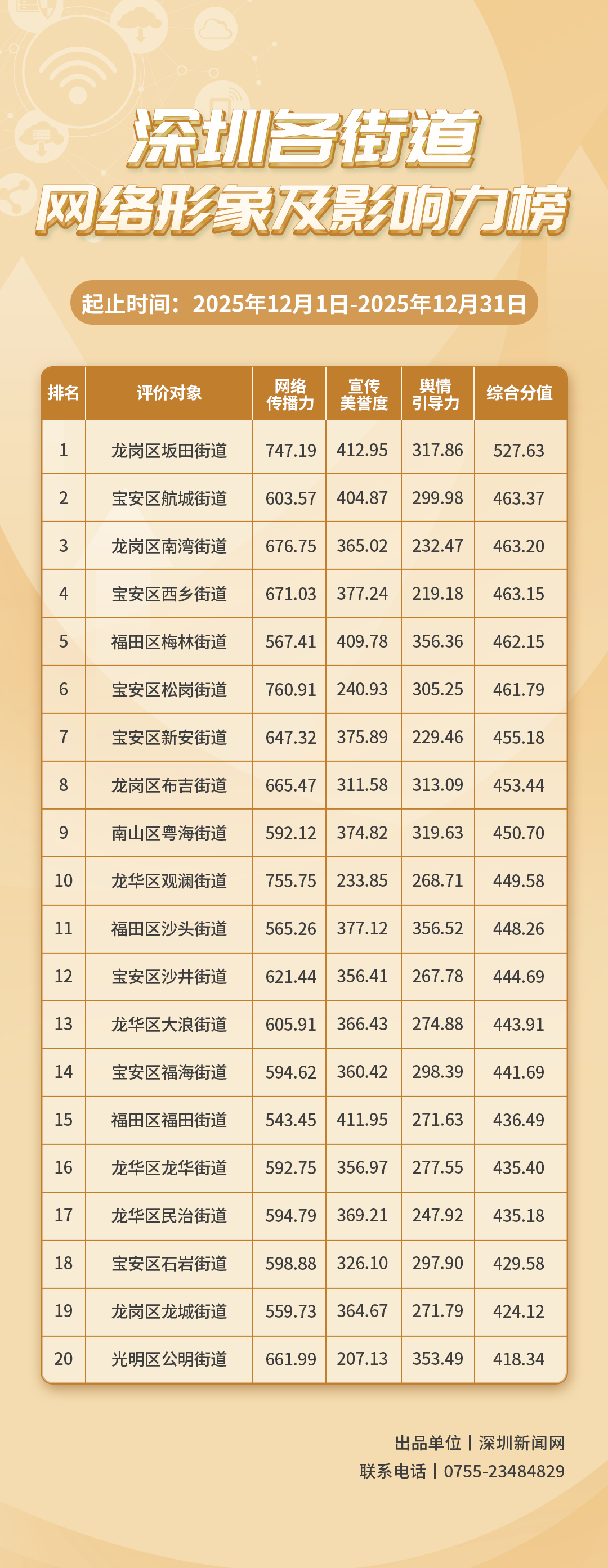 12月,各街道主動(dòng)把握網(wǎng)絡(luò)傳播邏輯,持續(xù)優(yōu)化治理路徑、拓展服務(wù)場(chǎng)景,以網(wǎng)絡(luò)搭建起政民互動(dòng)的“連心路”。《深圳各街道網(wǎng)絡(luò)形象及影響力榜》(12月榜單)已編制完成,對(duì)各街道在網(wǎng)絡(luò)空間的展現(xiàn)及其影響力進(jìn)行了全面的觀察與評(píng)估。本次榜單的數(shù)據(jù)統(tǒng)計(jì)時(shí)間跨度為2025年12月1日至12月31日。